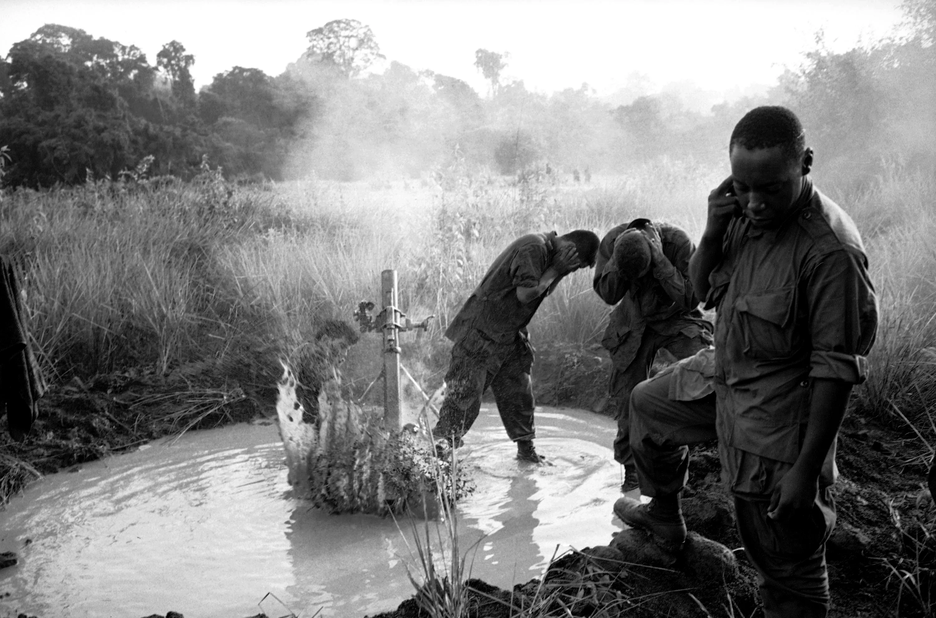 Muddy water in 81mm mortar emplacement filled by monsoon rains splashes over GI's as they fire a round toward a suspected Viet Cong position during an operation about 35 miles southeast of Saigon in Vietnam on July 21, 1966. (Photo by AP Photo)