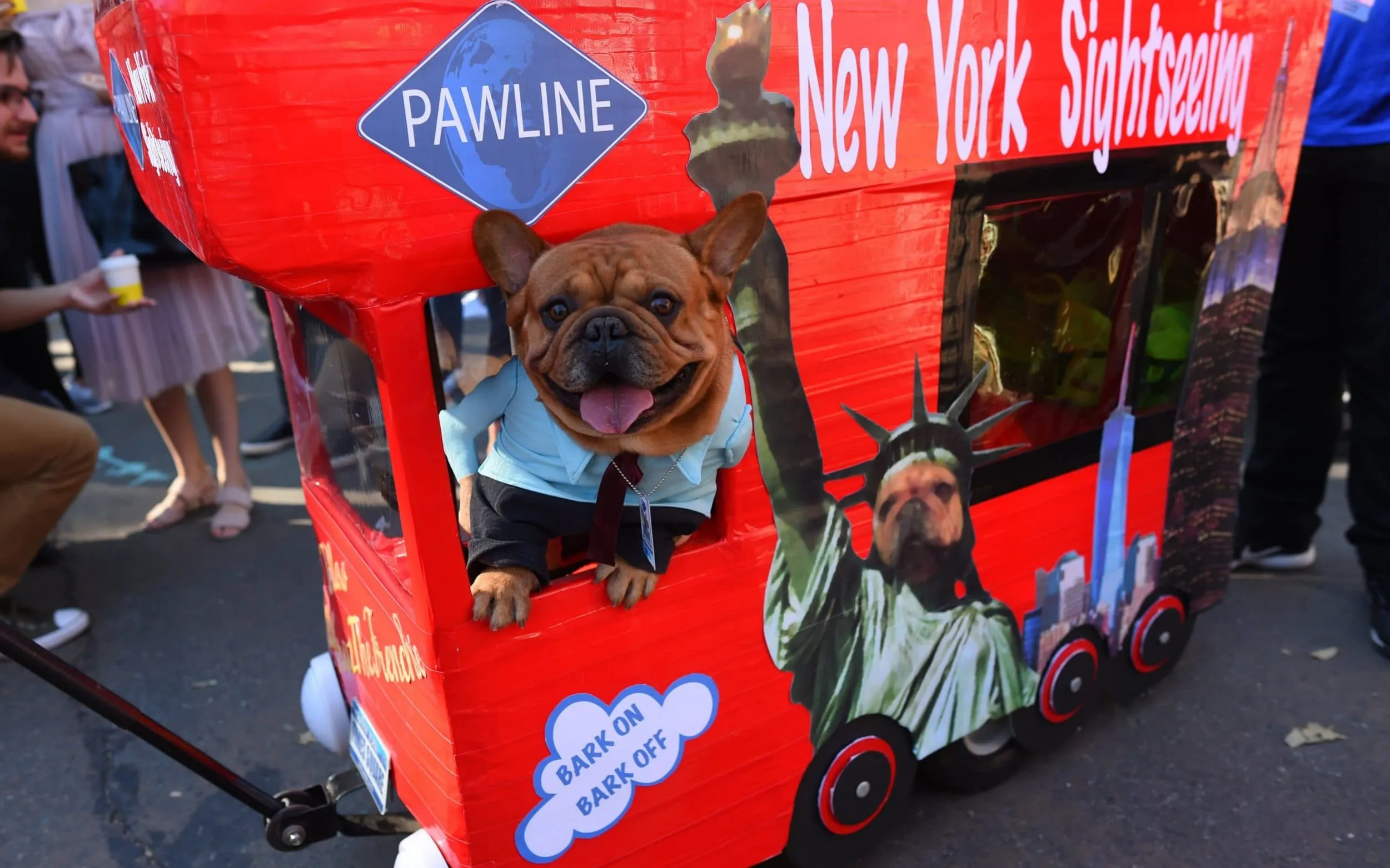 A dog in costume is seen during the 27th Annual Tompkins Square Halloween Dog Parade in Tompkins Square Park in New York on October 21, 2017. (Photo by Timothy A. Clary/AFP Photo)