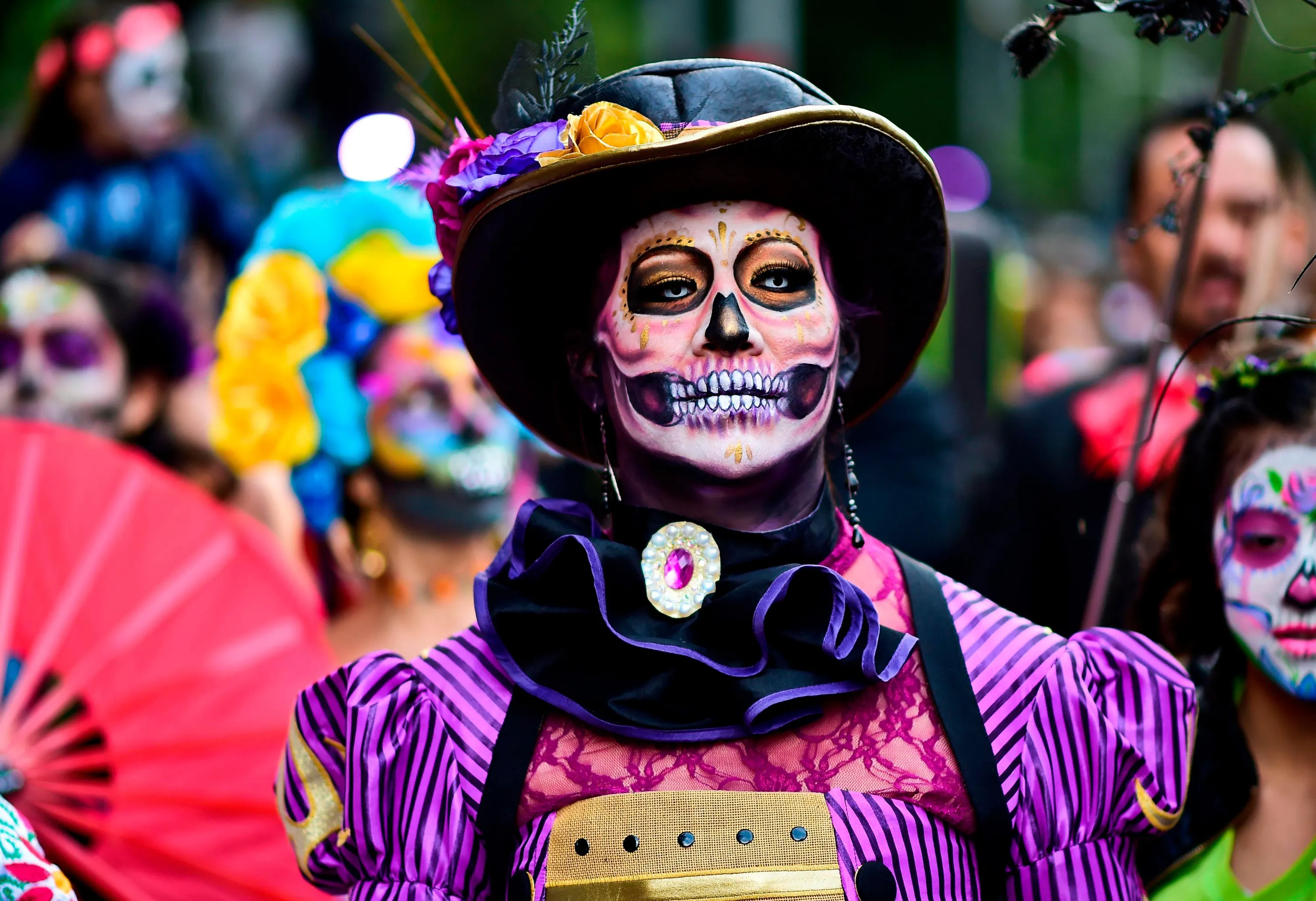 People disguised as “Catrina” (Mexican representation of death) take part in the “Catrinas Parade” along Reforma Avenue, in Mexico City on October 22, 2017. (Photo by Ronaldo Schemidt/AFP Photo)