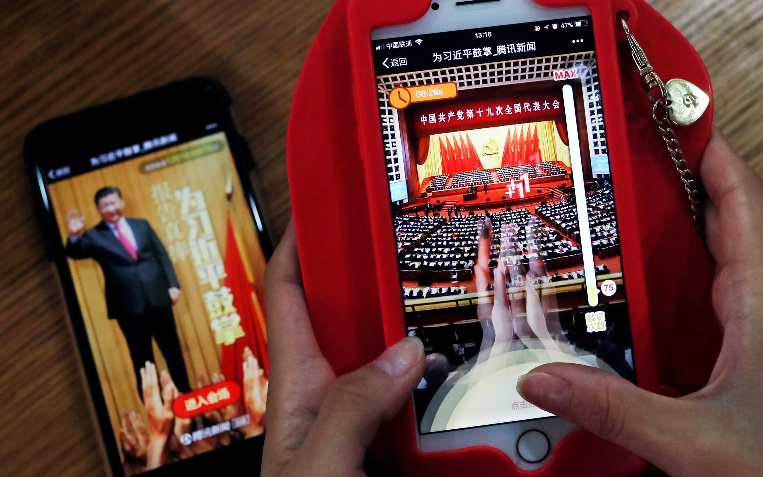 A woman poses as she playing a Tencent's smartphone game called “A Great Speech, clap for Xi Jinping” in Beijing, Friday, October 20, 2017. Ordinary young Chinese may not have paid close attention to Xi Jinping's 3-and-a-half hour marathon speech this week, but they're happy to “applaud” the president in the newest viral phenomenon to sweep China's internet. (Photo by Andy Wong/AP Photo)