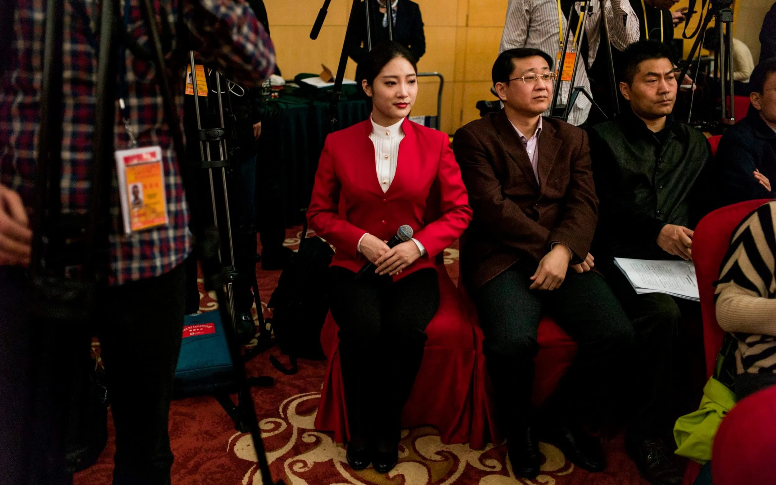 A hostess sits with journalists in the media centre during the Communist Party' s 19 th Congress in Beijing on October 20, 2017. The Chinese Communist Party opened its week- long, twice- a-decade congress on October 18 at the Great Hall of the People. (Photo by Fred Dufour/AFP Photo)