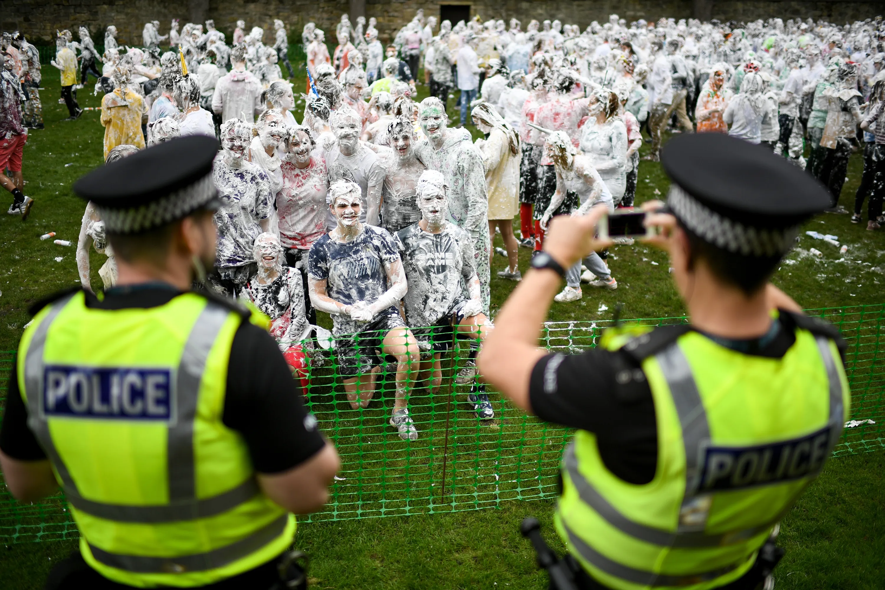 Students from St Andrews University indulge in a tradition of covering themselves with foam to honour the “academic family” on the lower college lawn on October 23, 2017, in St Andrews, Scotland. (Photo by Jeff J. Mitchell/Getty Images)