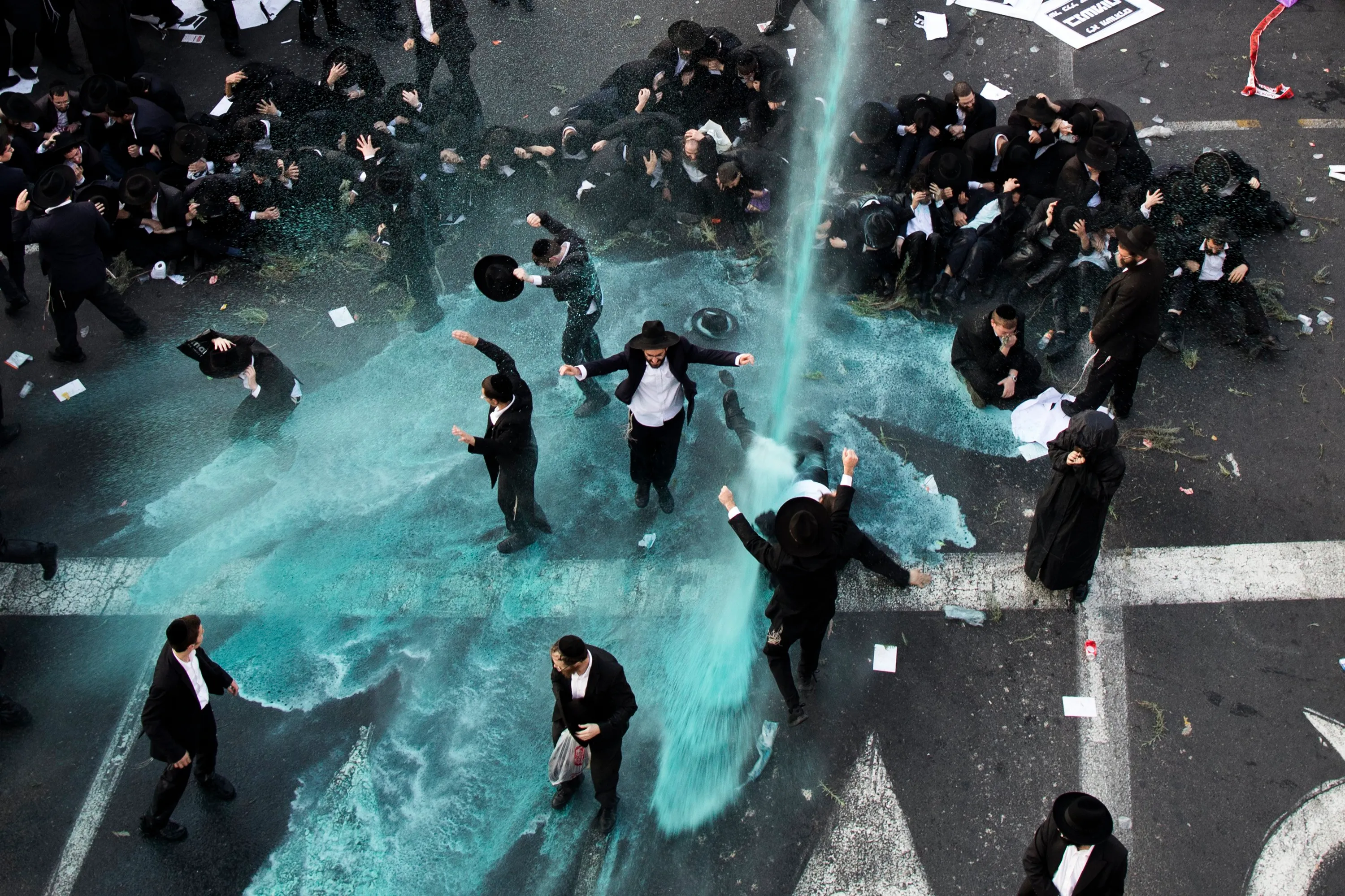 Police use water canon trying to disperse Ultra-Orthodox Jewish demonstrators as they block the main entrance to Jerusalem, during a protest against army recruitment in Jerusalem, Israel, 23 October 2017. The Ultra-Orthodox community in Israel is holding ongoing protest against army recruitment. (Photo by Abir Sultan/EPA/EFE)