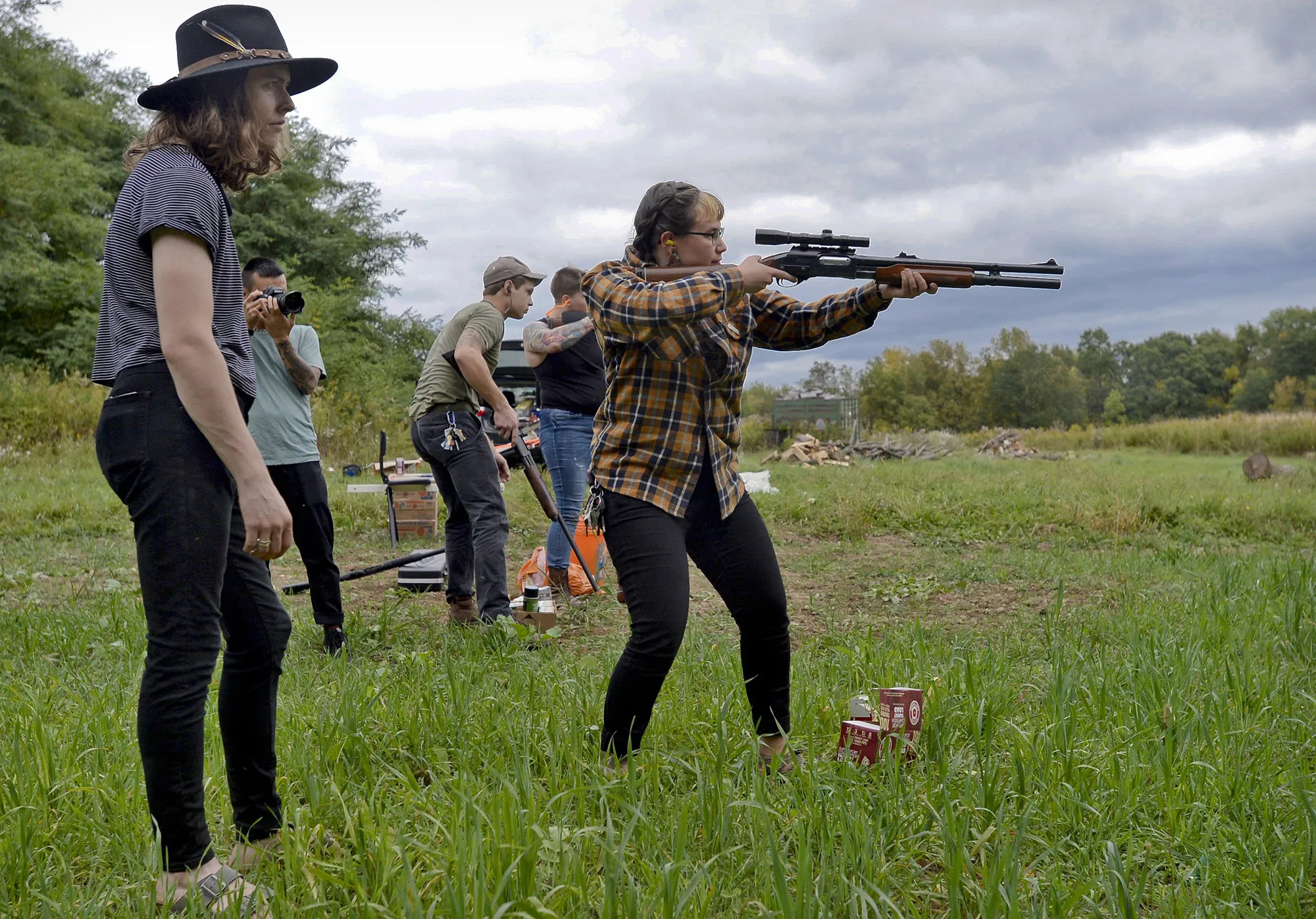 In this October 8, 2017, photo, Zora Gussow, center, aims a shotgun during a training session of the Trigger Warning Queer & Trans Gun Club in a field in Victor, N.Y. A dozen shooters in a field in upstate New York does not exactly represent a vanguard of a newly armed left. But the group is not alone. Jake Allen, who helped form the group, said there is another Trigger Warning chapter in Atlanta and he has received inquiries from people in about 10 other cities. (Photo by Adrian Kraus/AP Photo)