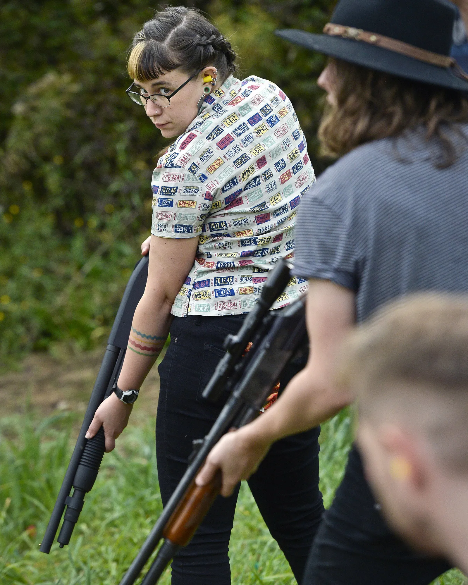 In this October. 8, 2017, photo, Zora Gussow, left, waits with a shotgun for a clay target to be thrown during a training session of the Trigger Warning Queer & Trans Gun Club in Victor, N.Y. (Photo by Adrian Kraus/AP Photo)