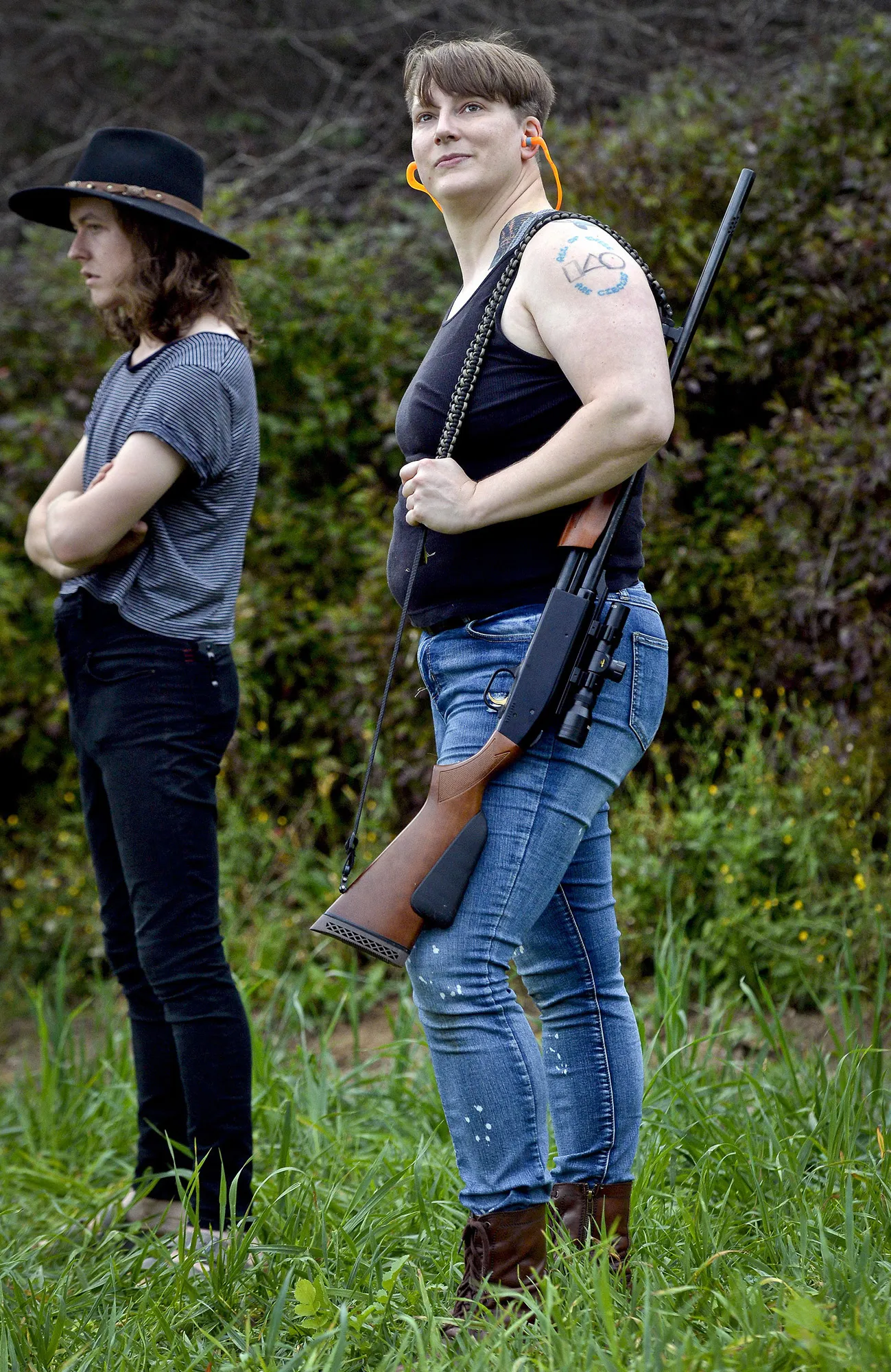 In this October 8, 2017, photo, Lore McSpadden, right, and Jon Dumont wait to shoot at clay targets during a training session for the Trigger Warning Queer & Trans Gun Club in Victor, N.Y. (Photo by Adrian Kraus/AP Photo)