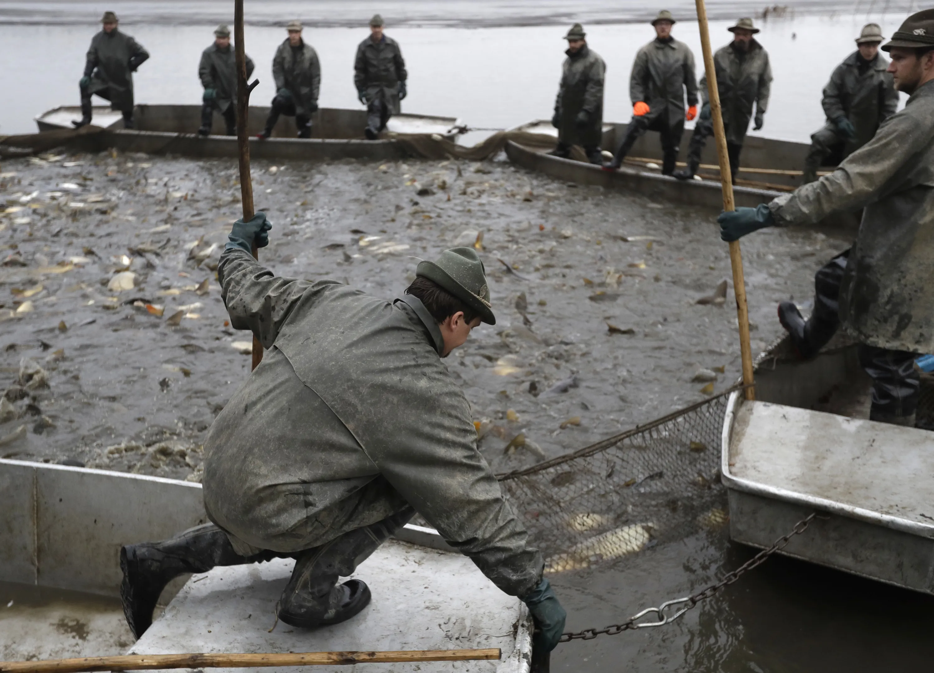 Fishermen look on surrounding their catch during a traditional fish haul of the Horusicky pond near the town of Veseli nad Luznici, Czech Republic, Tuesday, October 24, 2017. (Photo by Petr David Josek/AP Photo)