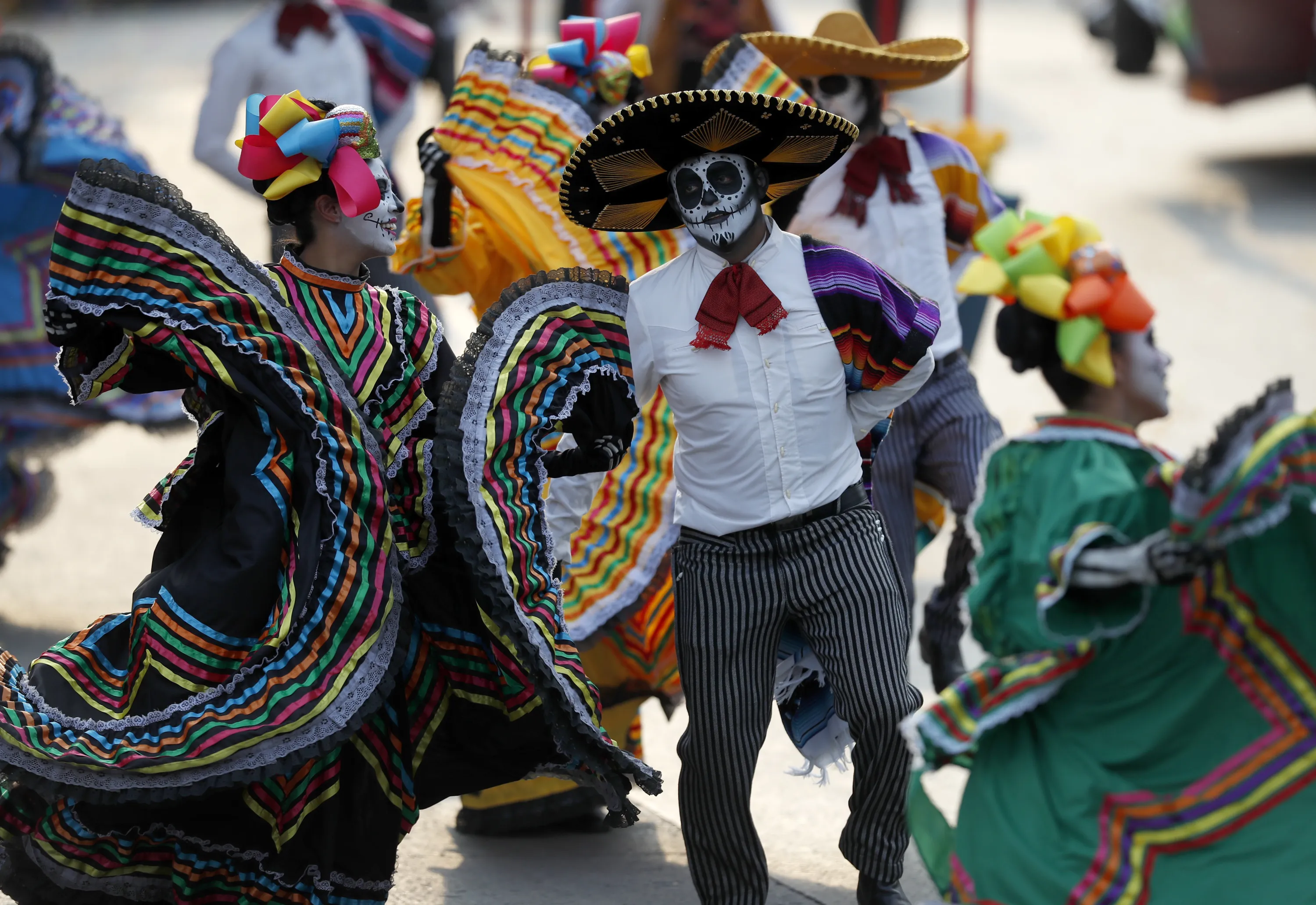 Performers participate in the Day of the Dead parade on Mexico City's main Reforma Avenue, Saturday, October 28, 2017. (Photo by Eduardo Verdugo/AP Photo)