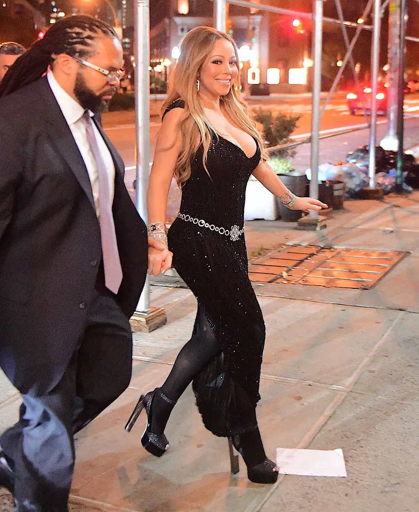 Mariah Carey looked better than ever on Monday night, October 23, 2017 as she stepped out in NYC. She performed at the V Magazine Party honoring Karl Lagerfeld, before heading to Blue Ribbon Sushi with her boyfriend Bryan Tanaka. Mariah displayed her stunning weight loss in a tight black dress, with a very low cut front. She seemed unfazed after being robbed of $50,000 worth of goods from her LA Home. When asked if the thief had been caught , Mariah scoffed and appeared uninterested in finding the crook at all. She said “I hope they like it” and casually strutted into her Tribeca Penthouse. (Photo by 247PAPS.TV/Splash News and Pictures)