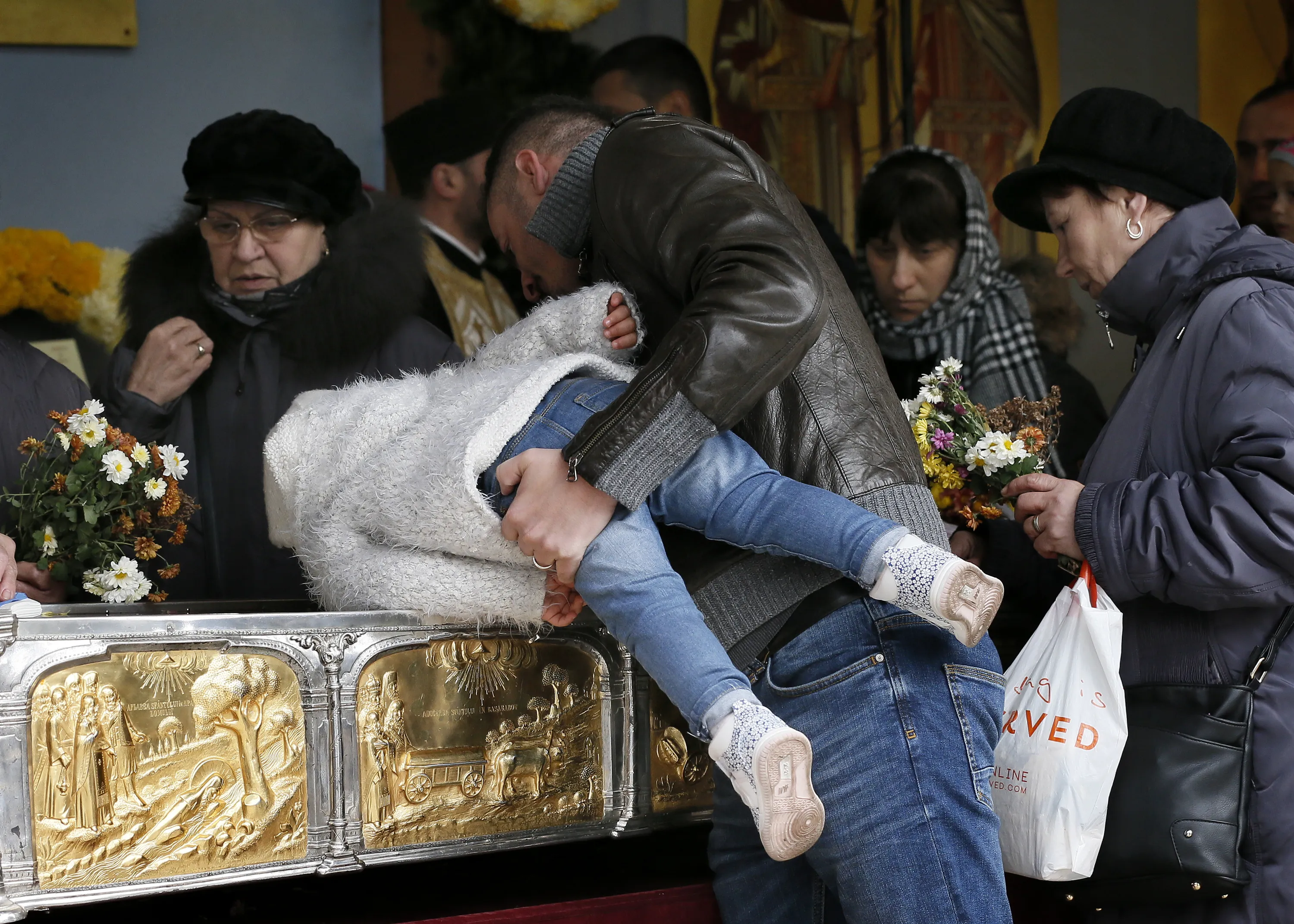A Romanian father helps his boy to kiss the golden box containing the relics of Saint Dimitrie Basarabov during a mass attended by Kirill (not pictured), the Russian Orthodox Patriarch of Moscow and All Russia, at Patriarchal Cathedral in Bucharest, Romania, 27 October 2017. Russian Patriarch Kirill arrived yesterday at the invitation of his Romanian counterpart Daniel to take part at the pilgrimage at the relics of the Saint Dimitrie Basarabov, the patron saint of Romania's capital. The heads of Romanian and Russian Orthodox churches commemorate all the victims of the communist regimes in their countries who stand to defend their orthodox faith with the price of their liberty or life, during the morning mass. (Photo by Robert Ghement/EPA/EFE)
