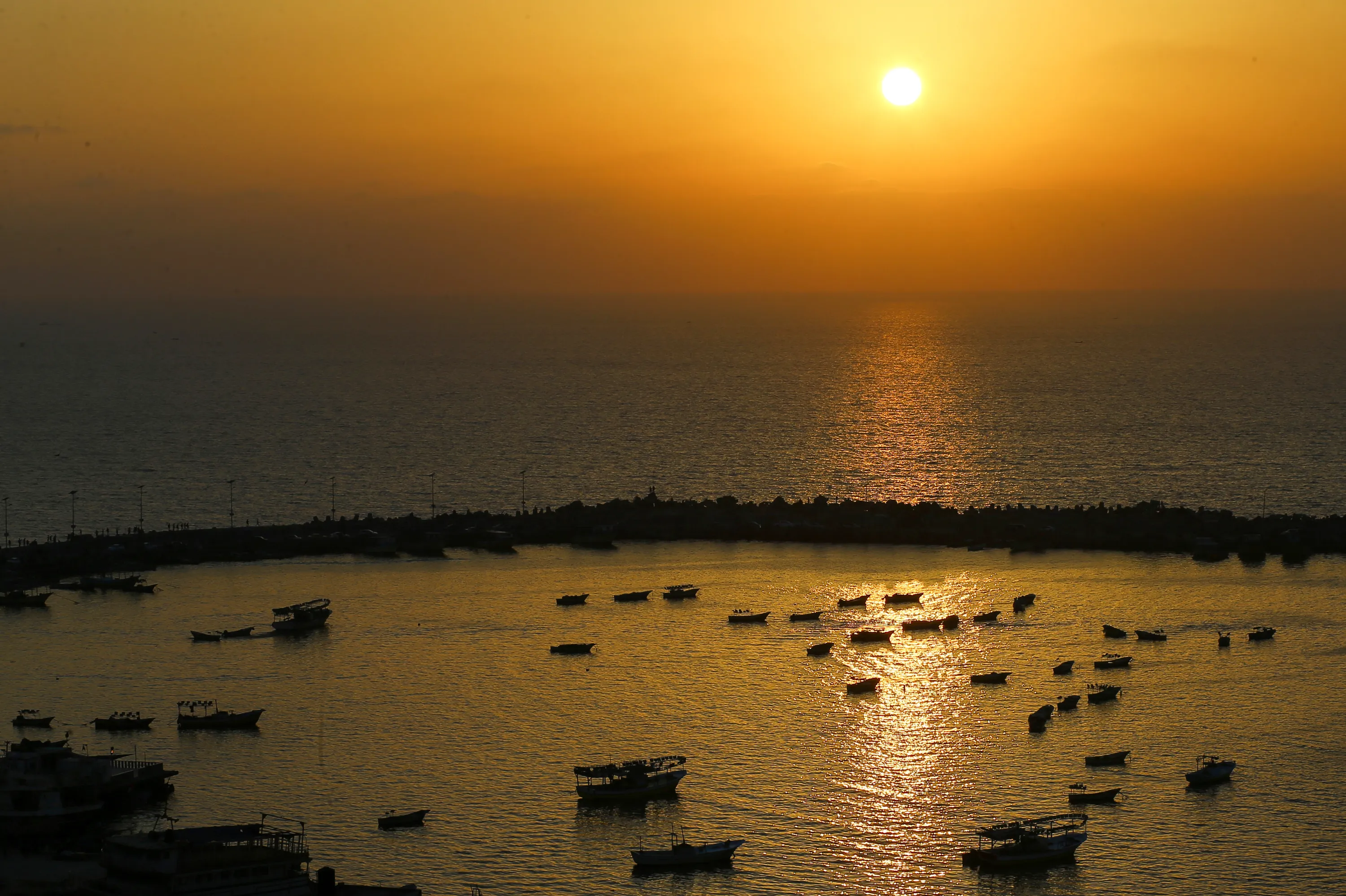 A picture taken on May 5, 2017 shows a general view of the boats moored in the seaport of Gaza City at sunset. (Photo by Mohammed Abed/AFP Photo)