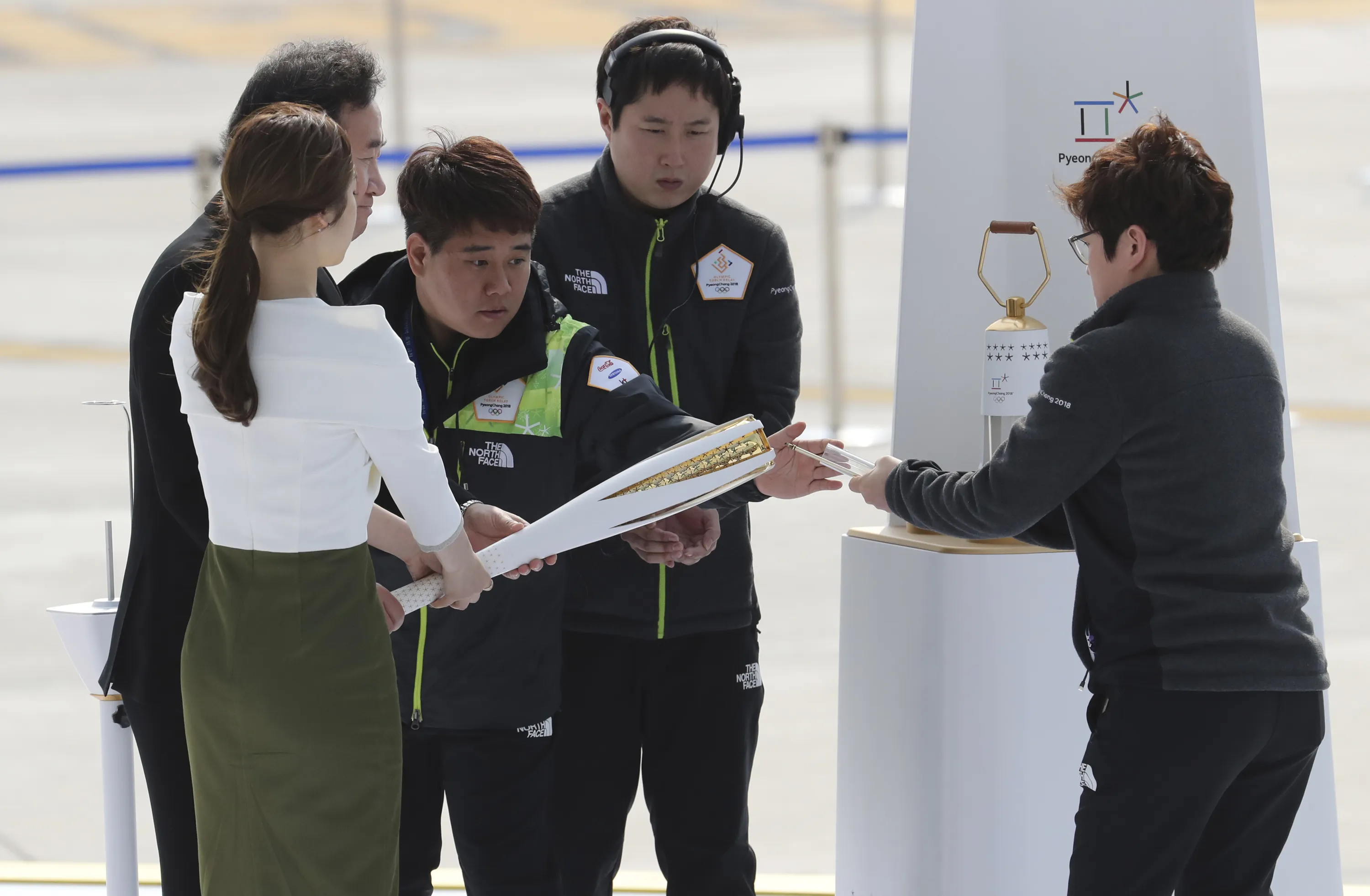 South Korean Prime Minister Lee Nak-yon, rear left, and former South Korean Olympic figure skating champion Yuna Kim, left, light an Olympic torch during the Olympic Flame Arrival ceremony at Incheon International Airport in Incheon, South Korea, Wednesday, November 1, 2017. (Photo by Lee Jin-man/AP Photo)