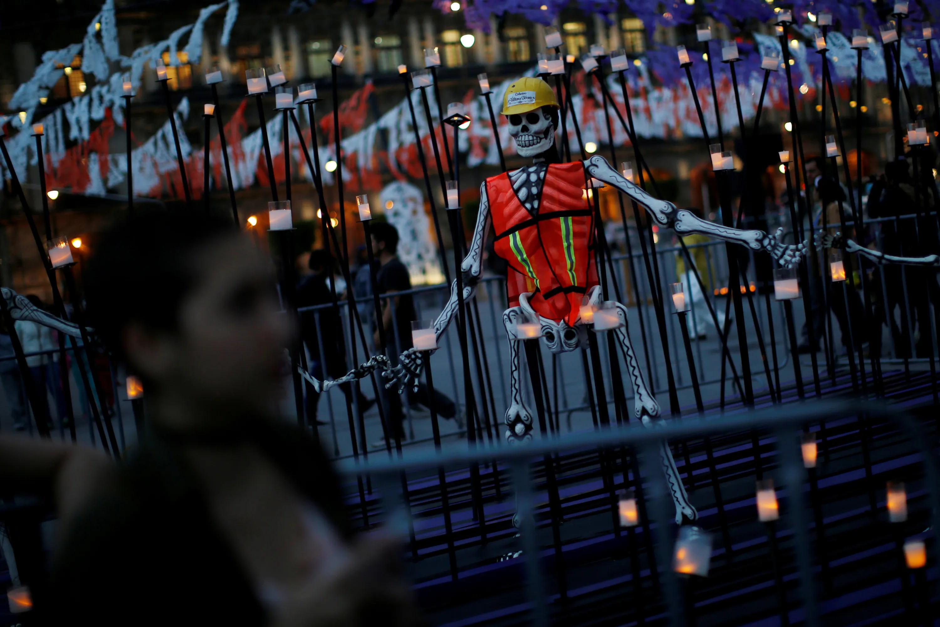 An altar displays a paper skeleton representing a rescue worker as part for the upcoming annual Day of the Dead on November 1 and 2, at the Zocalo in Mexico City, Mexico, October 30, 2017. (Photo by Carlos Jasso/Reuters)