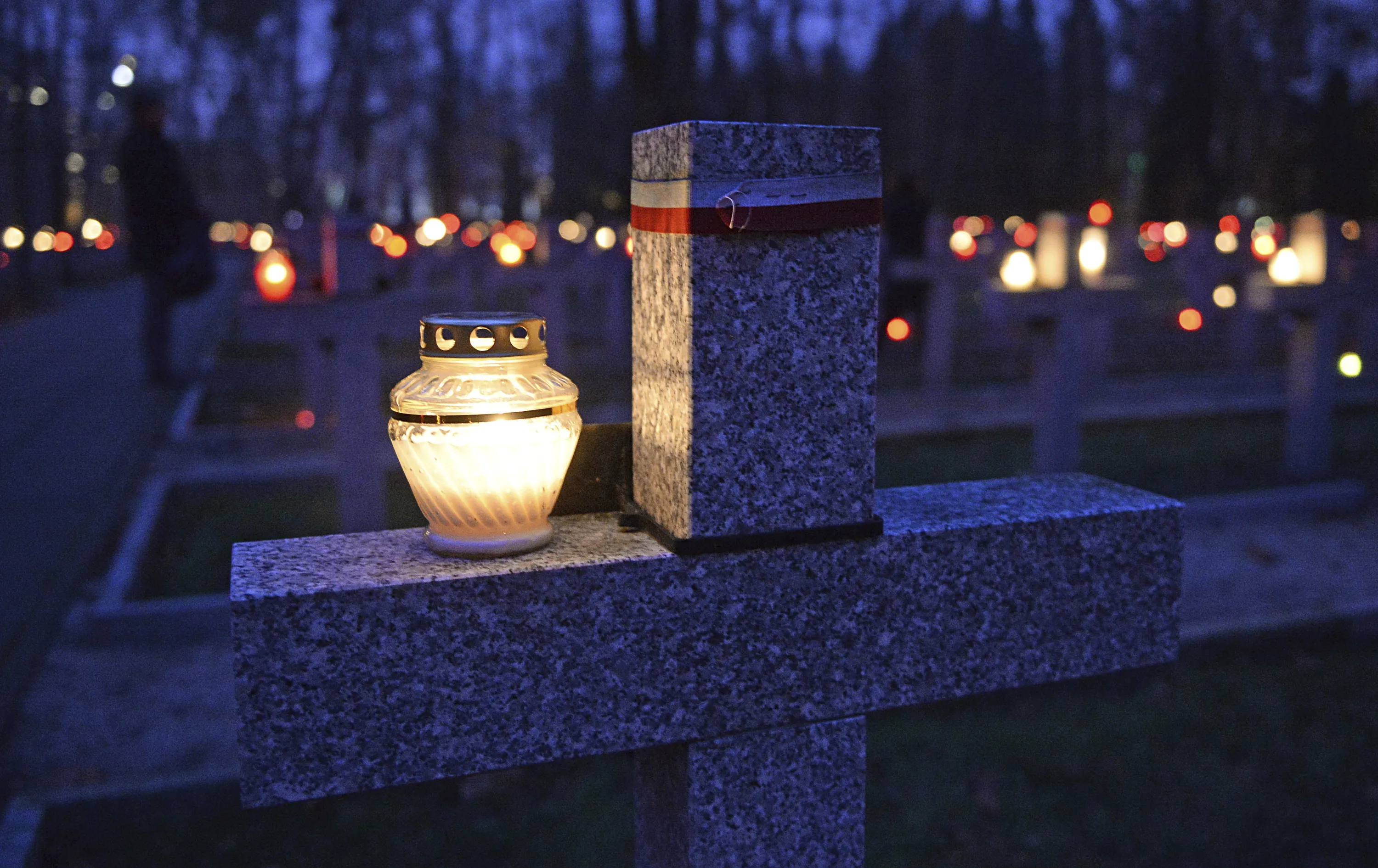 A man stands next to graves at the Powazki cemetery in Warsaw, Poland, Wednesday, November 1, 2017. Candles and flowers cover tombstones in graveyards across Poland on All Saints' Day, as people honour the saints and their departed friends and family, in Christian tradition. (Photo by Alik Keplicz/AP Photo)