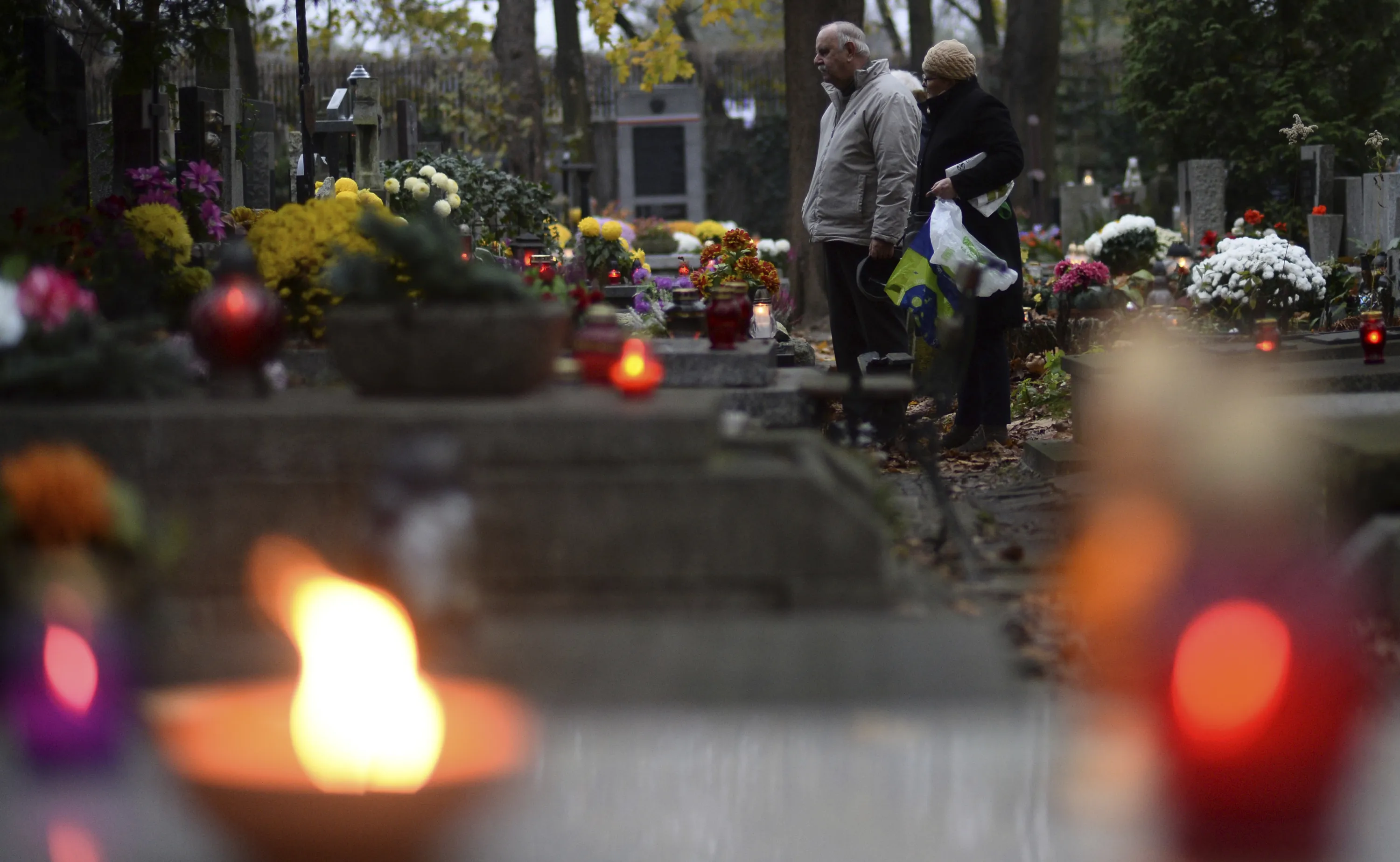 People stop in front of a grave at the Powazki cemetery in Warsaw, Poland, Wednesday, November 1, 2017. Candles and flowers cover tombstones in graveyards across Poland on All Saints' Day, as people honour the saints and their departed friends and family, in Christian tradition. (Photo by Alik Keplicz/AP Photo)