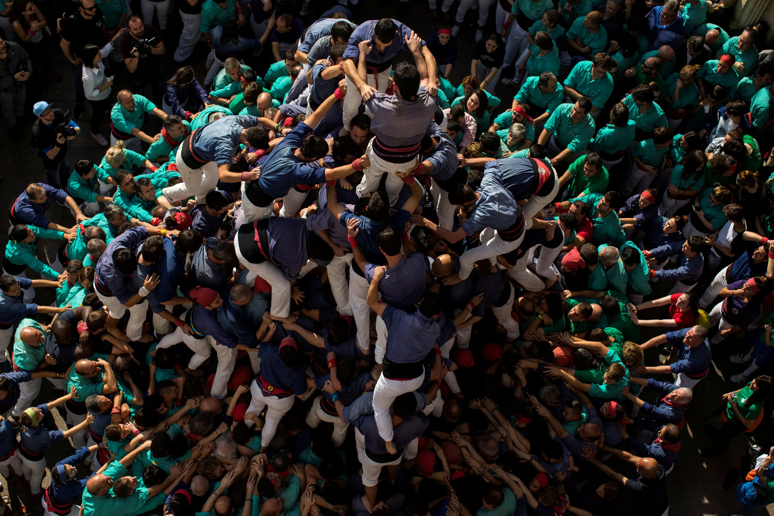 The group Colla els Capgrossos de Mataro form a human tower called “Castell” during the All Saints Day in Vilafranca del Penedes town, near Barcelona, Spain, November 1, 2017. (Photo by Juan Medina/Reuters)