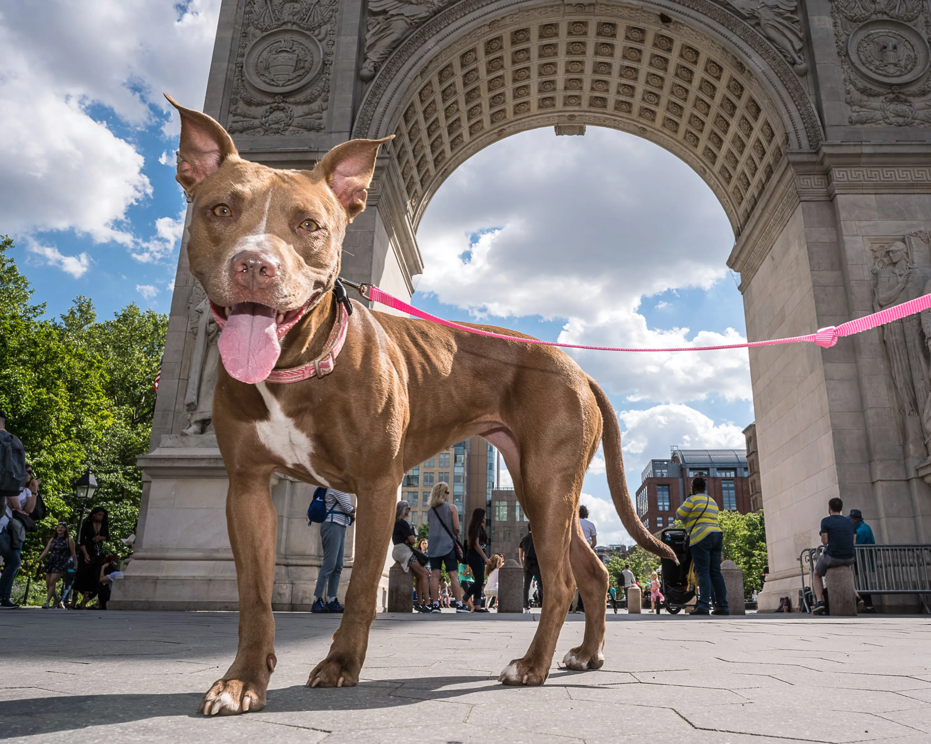 Happy Pit Bull mix enjoying a sunny day Washington Square Park, NYC. (Photo by Mark McQueen/Caters News Agency)