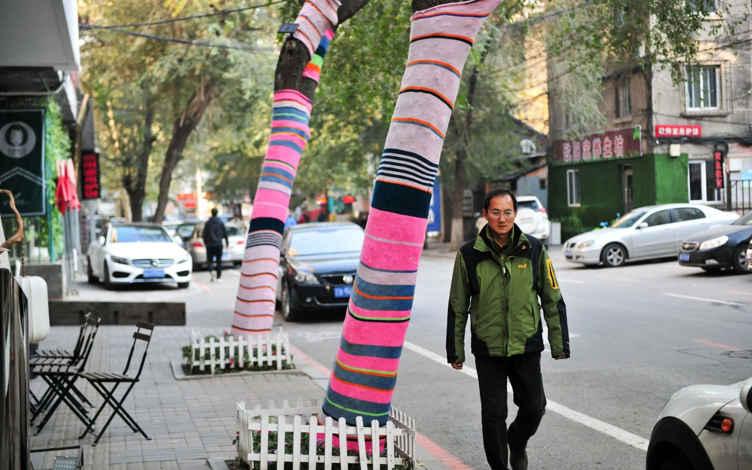 Trees are seen enveloped with woollen cloth along a street on October 24, 2017 in Shenyang, Liaoning Province of China. Some trees wear sweaters on cold days in Shenyang. (Photo by VCG/VCG via Getty Images)