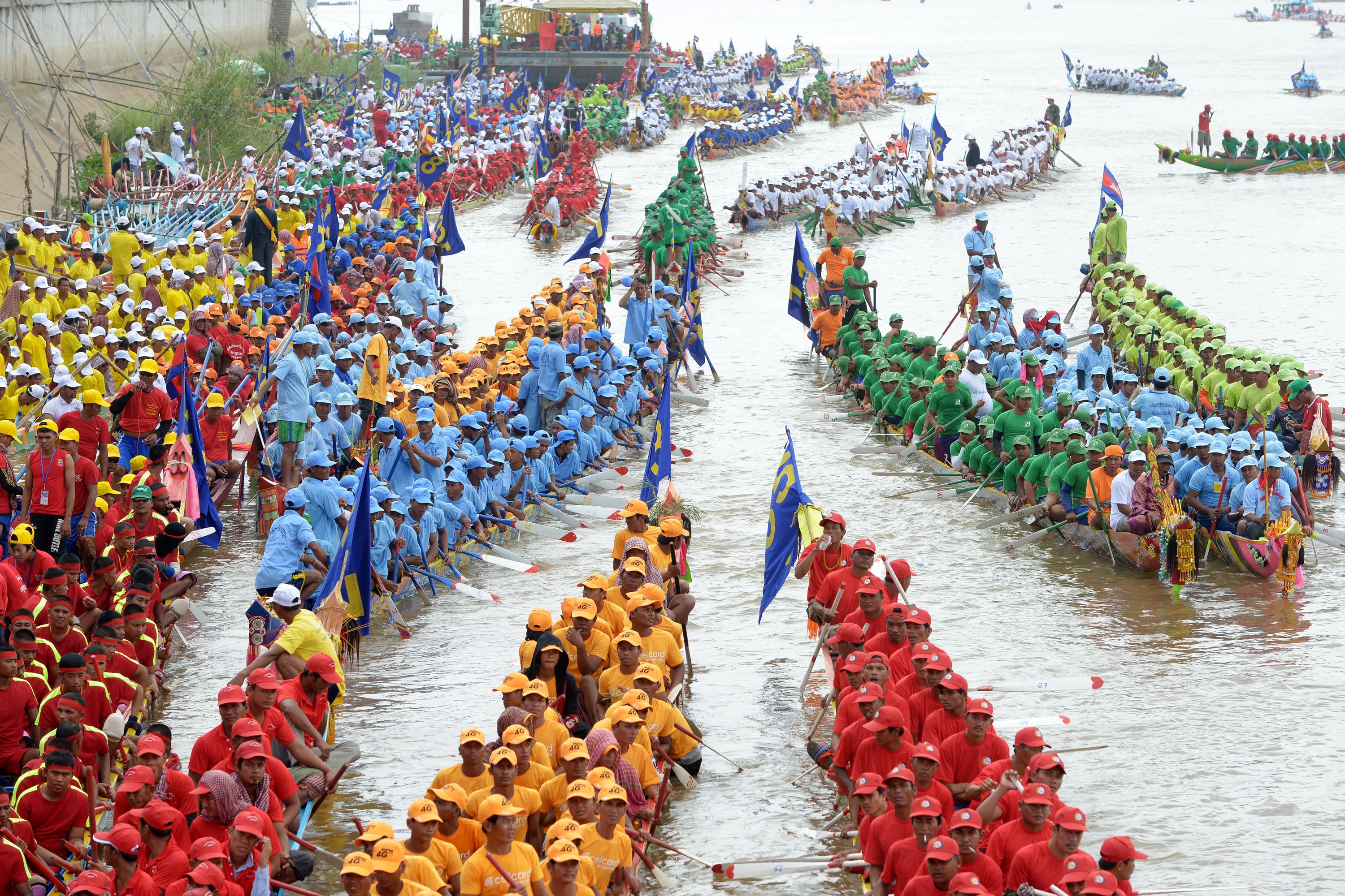 Cambodian participants row their dragon boats during the Water Festival on the Tonle Sap river in Phnom Penh on November 2, 2017. Tens of thousands of Cambodian spectators flocked to the riverfront in the capital Phnom Penh on November 2 to watch the boat races as the country celebrates the annual water festival. (Photo by Tang Chhin Sothy/AFP Photo)
