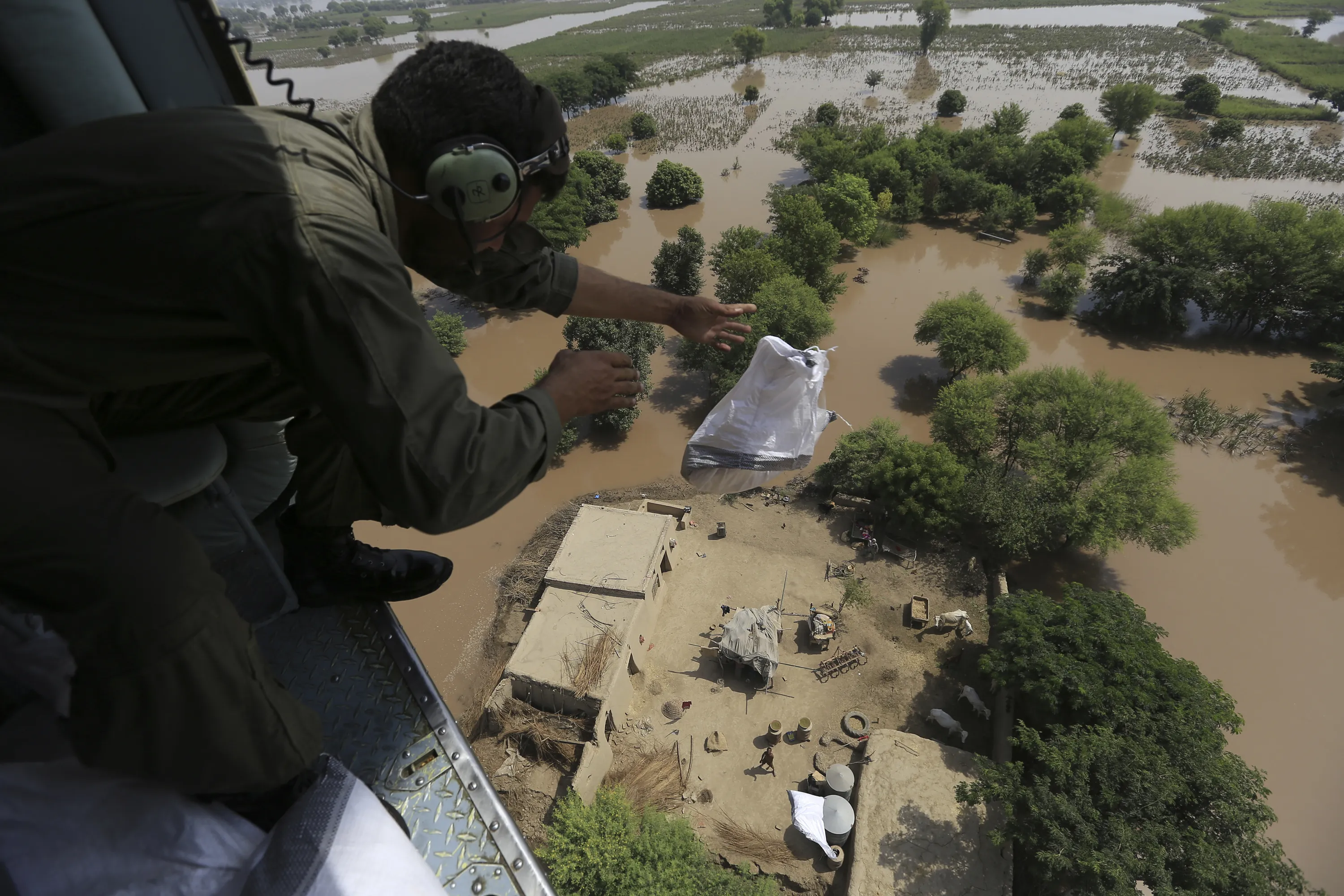 A Pakistani Army soldier distributes food bags from a helicopter in flooded areas in Shujabad, on the outskirts of Multan, Pakistan,15 September 2014. Pakistani troops and rescue workers on 15 September raced to evacuate thousands of people as swollen rivers headed towards the southern province of Sindh. Mudslides and flooding killed more than 280 in the central province of Punjab and parts of disputed Kashmir region, the National Disaster Management Authority said. (Photo by Omer Saleem/EPA)
