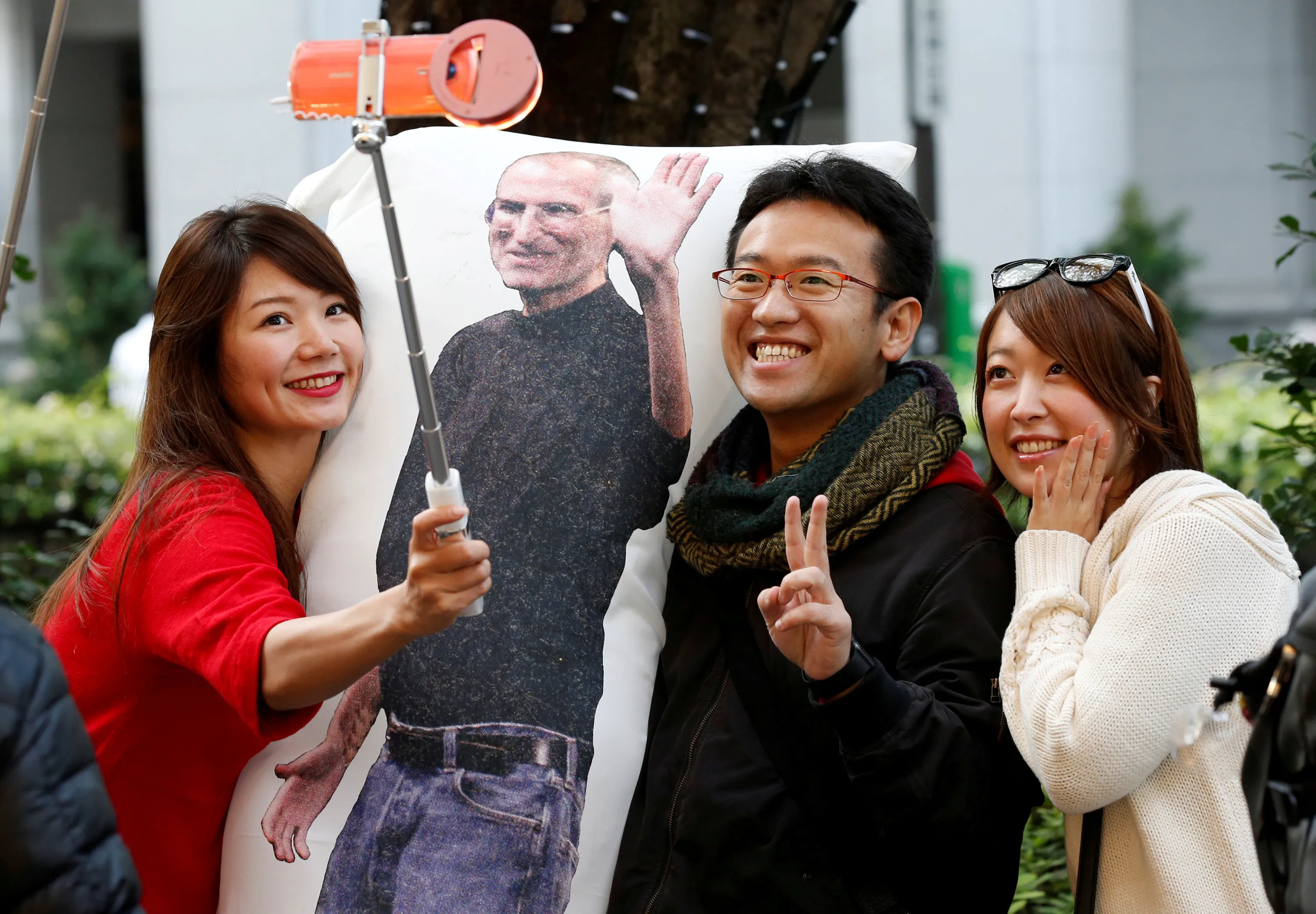 Ayano Tominaga (L) and other customers pose for a selfie photo with a cushion printed with a portrait of Apple co-founder Steve Jobs on it, as they wait in queue for the release of Apple's new iPhone X in front of the Apple Store in Tokyo's Omotesando shopping district, Japan, November 3, 2017. (Photo by Toru Hanai/Reuters)