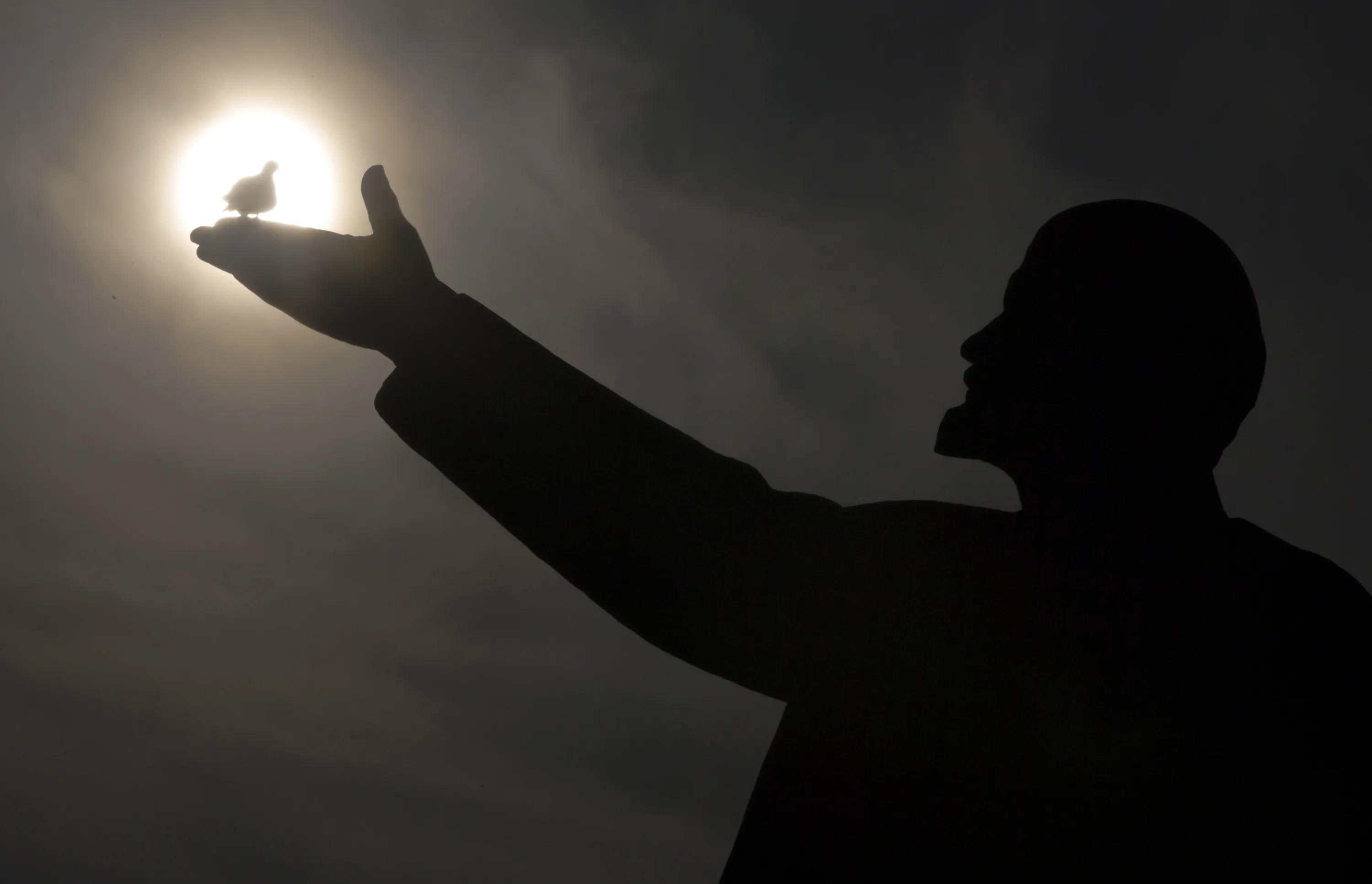 In this Tuesday, October 31, 2017 file photo, a bird silhouetted by the sun sits on the hand of a statue of Soviet Union founder Vladimir Lenin in Russian leased Baikonur cosmodrome, Kazakhstan. (Photo by Dmitri Lovetsky/AP Photo)