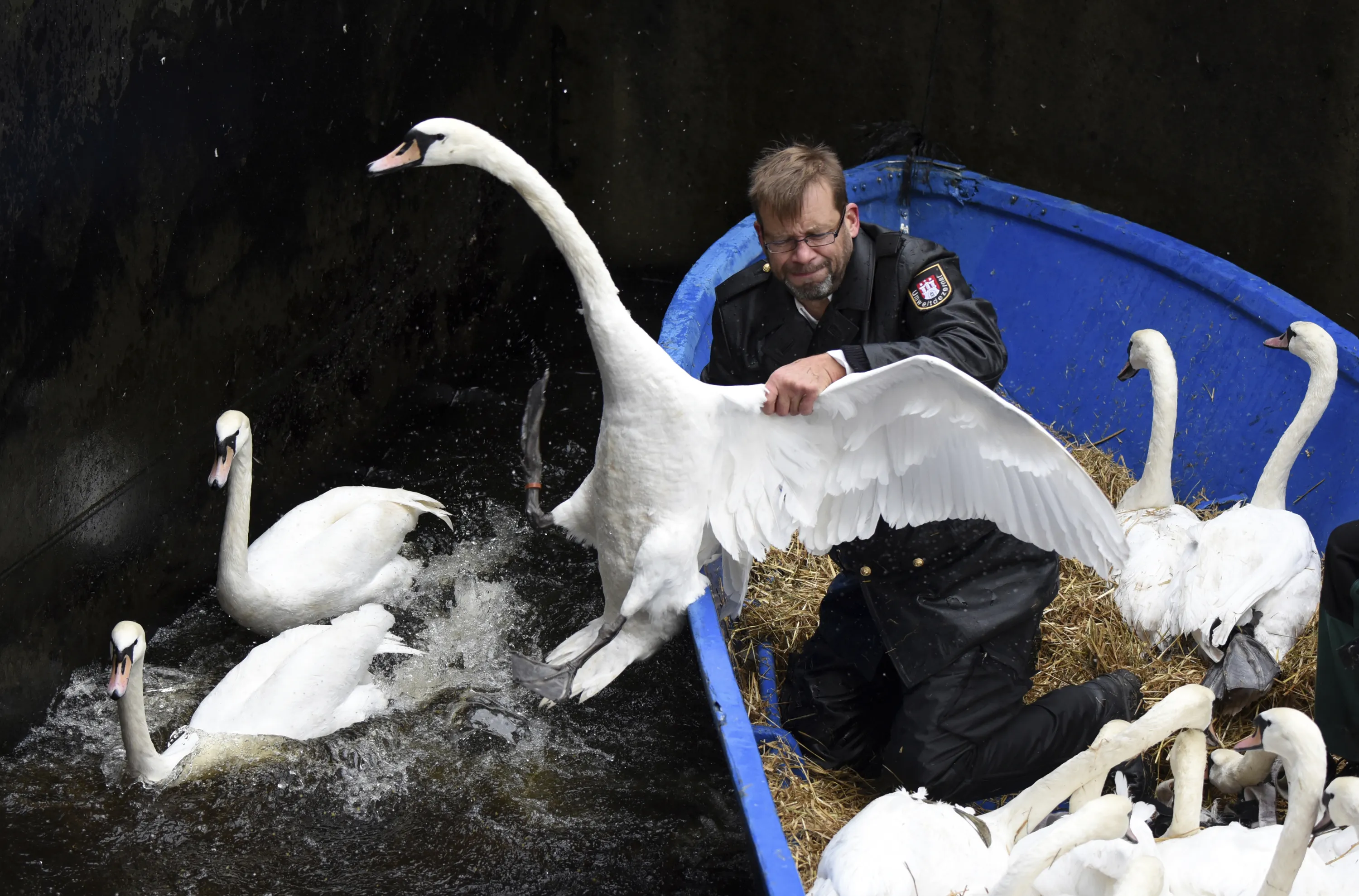 Olaf Niess catches a swan as he transports swans to their winter enclosure on Alster river in Hamburg, Germany, Tuesday, November 7, 2017. (Photo by Daniel Bockwoldt/DPA via AP Photo)