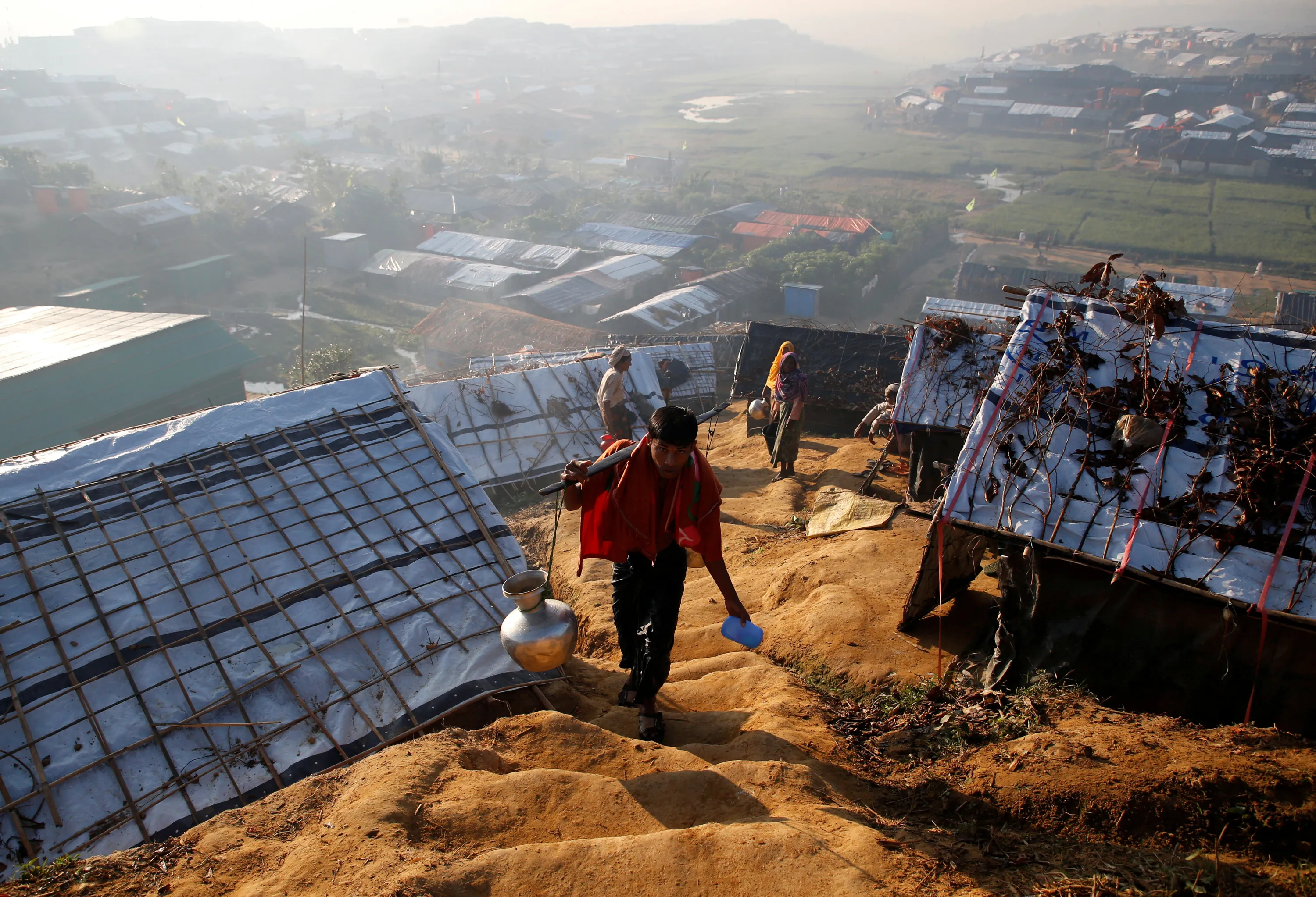 A Rohingya refugee walks uphill carrying a vessel filled with water at Palongkhali refugee camp, near Cox's Bazar, Bangladesh on November 7, 2017. (Photo by Navesh Chitrakar/Reuters)