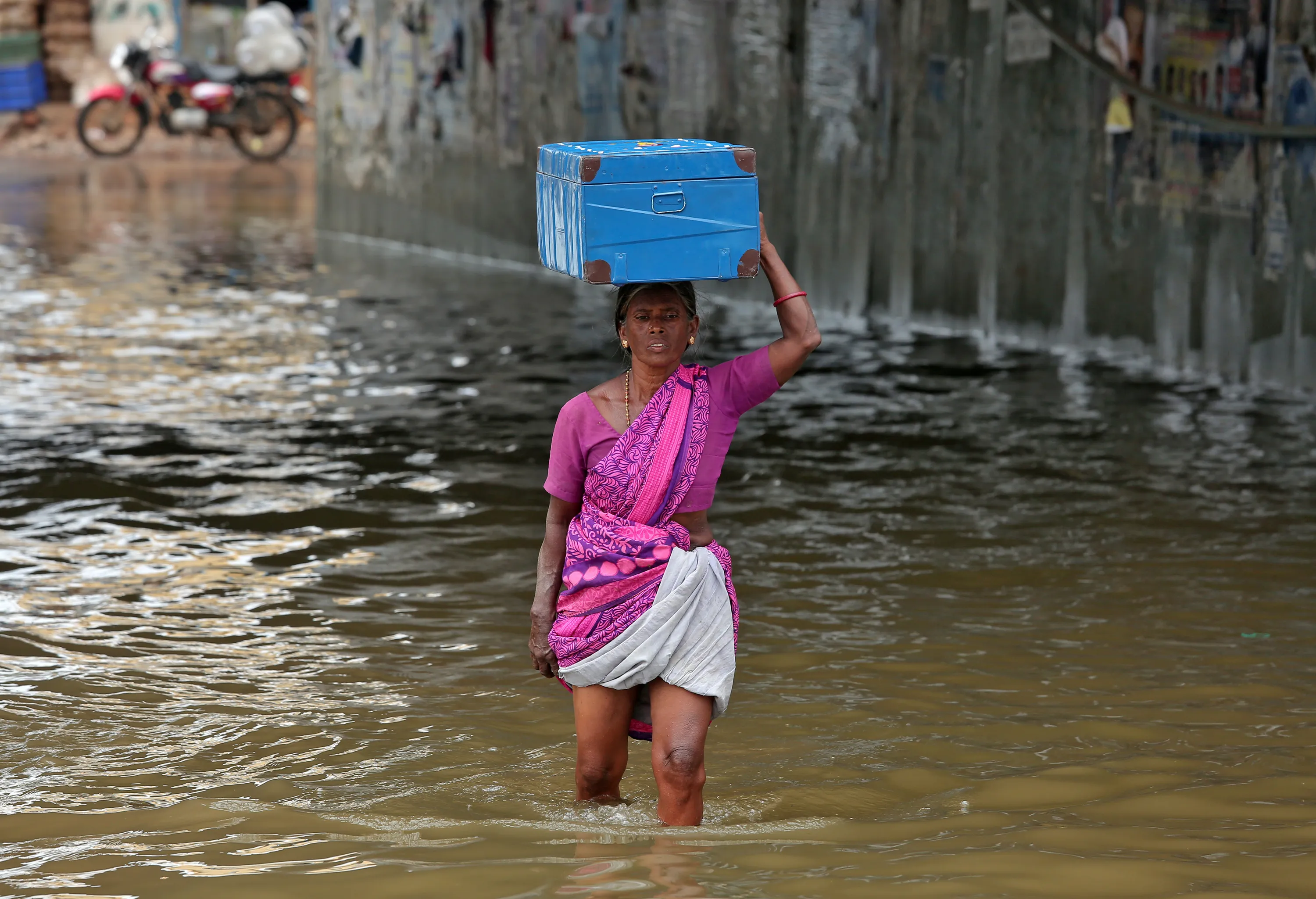 A woman carrying a box on her head wades through a water-logged subway after rains in Chennai, November 3, 2017. (Photo by P. Ravikumar/Reuters)