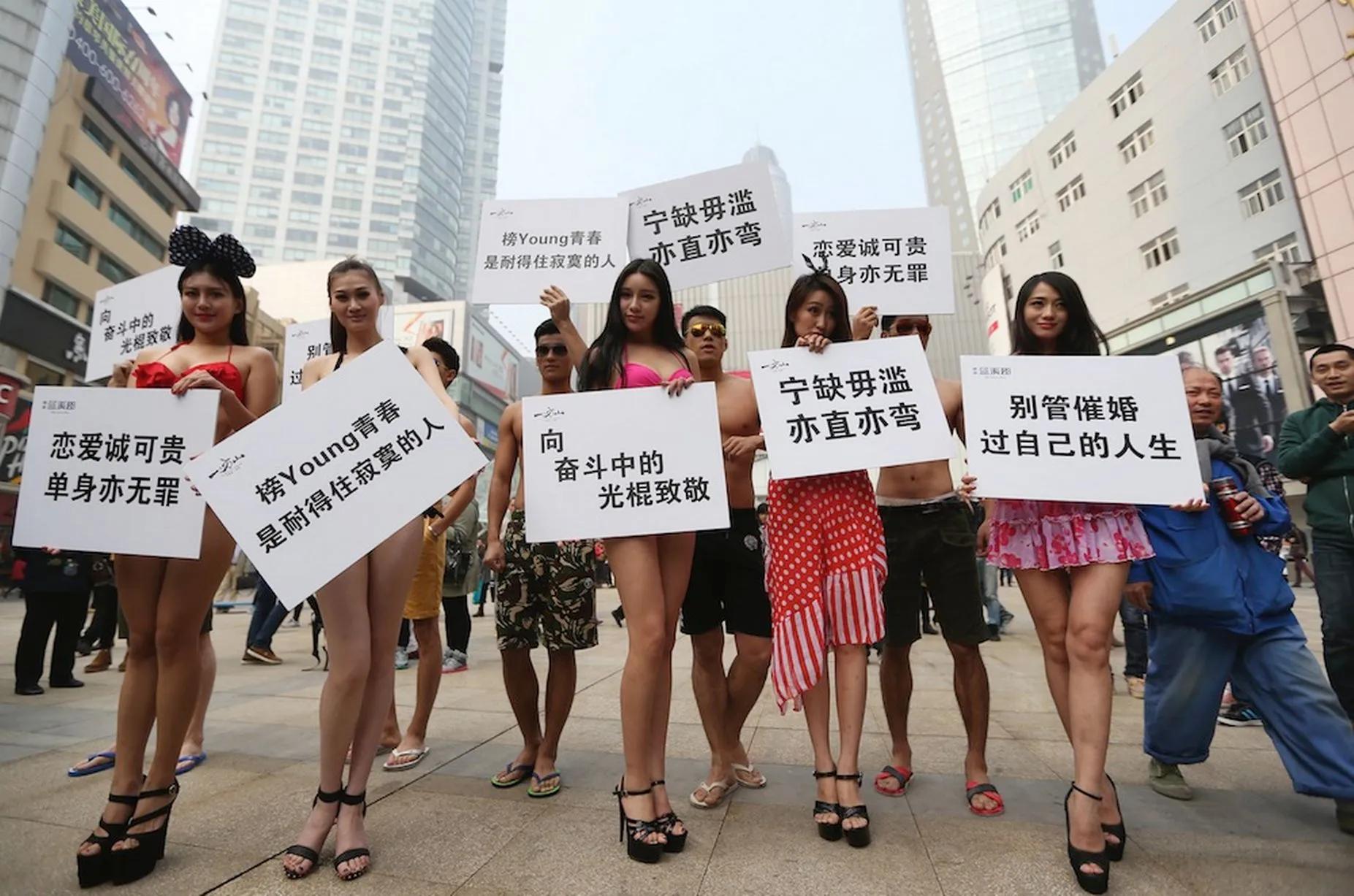 Several half naked men and bikini women celebrate the Singles’ Day on the street on 11th November, 2014 in Nanjing, Jiangsu,China. (Photo by TPG/Getty Images)