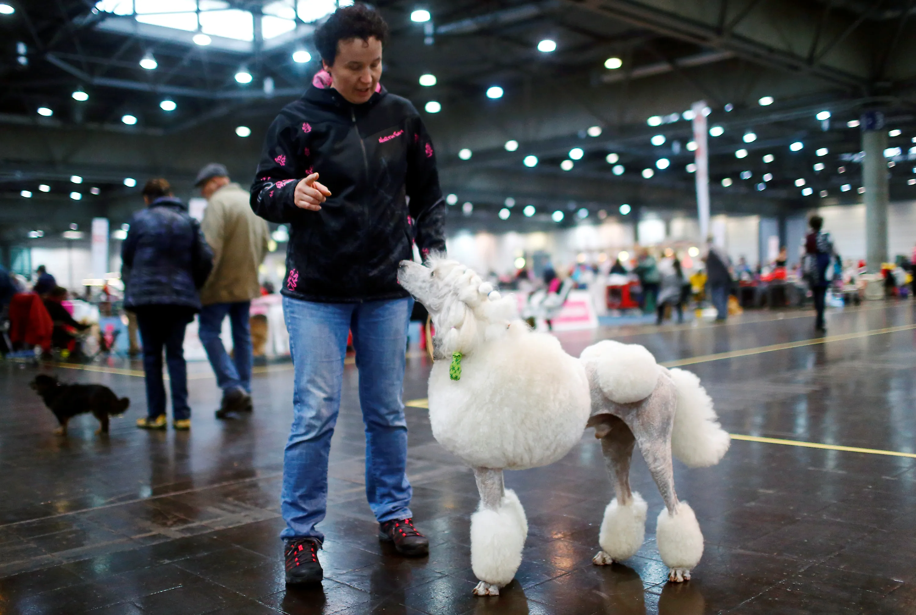 A woman and her dog pose during the “World Dog Show” in Leipzig, Germany, November 10, 2017. (Photo by Hannibal Hanschke/Reuters)