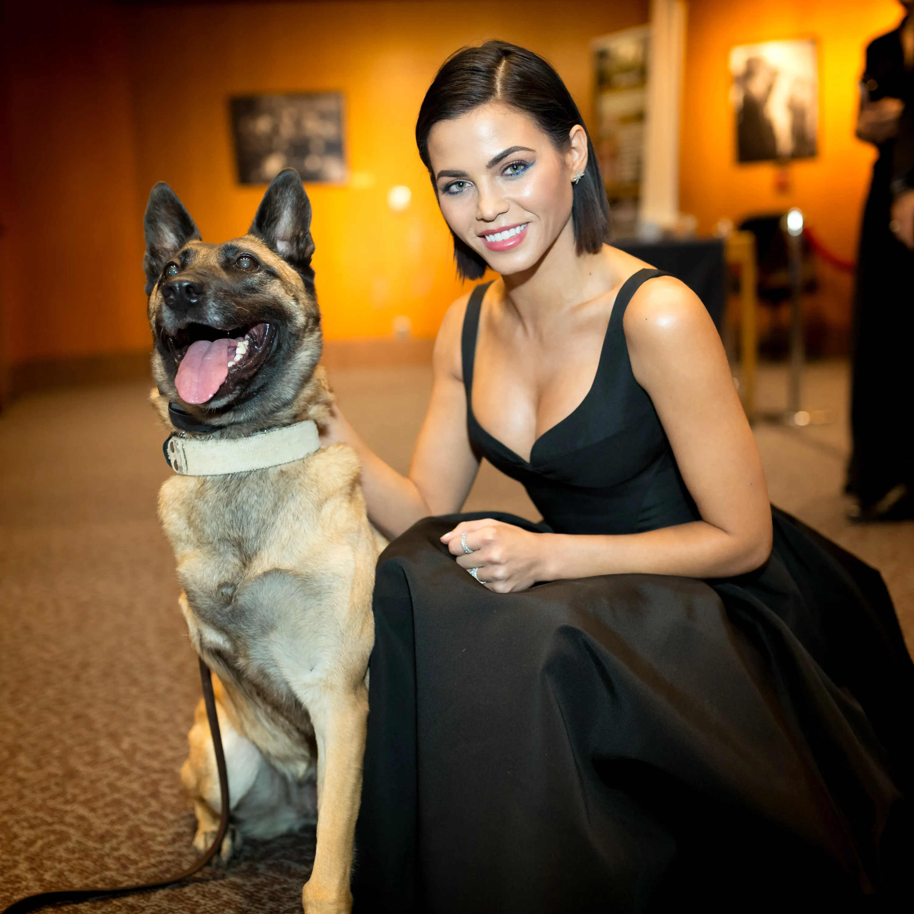 Actress Jenna Dewan Tatum meets Layka as she attends the HBO And Army Ranger Lead The Way Fun Present The Premiere Of “War Dog: A Soldier's Best Friend” after party at The Directors Guild Of America on November 6, 2017 in Los Angeles, California. (Photo by Greg Doherty/Getty Images)