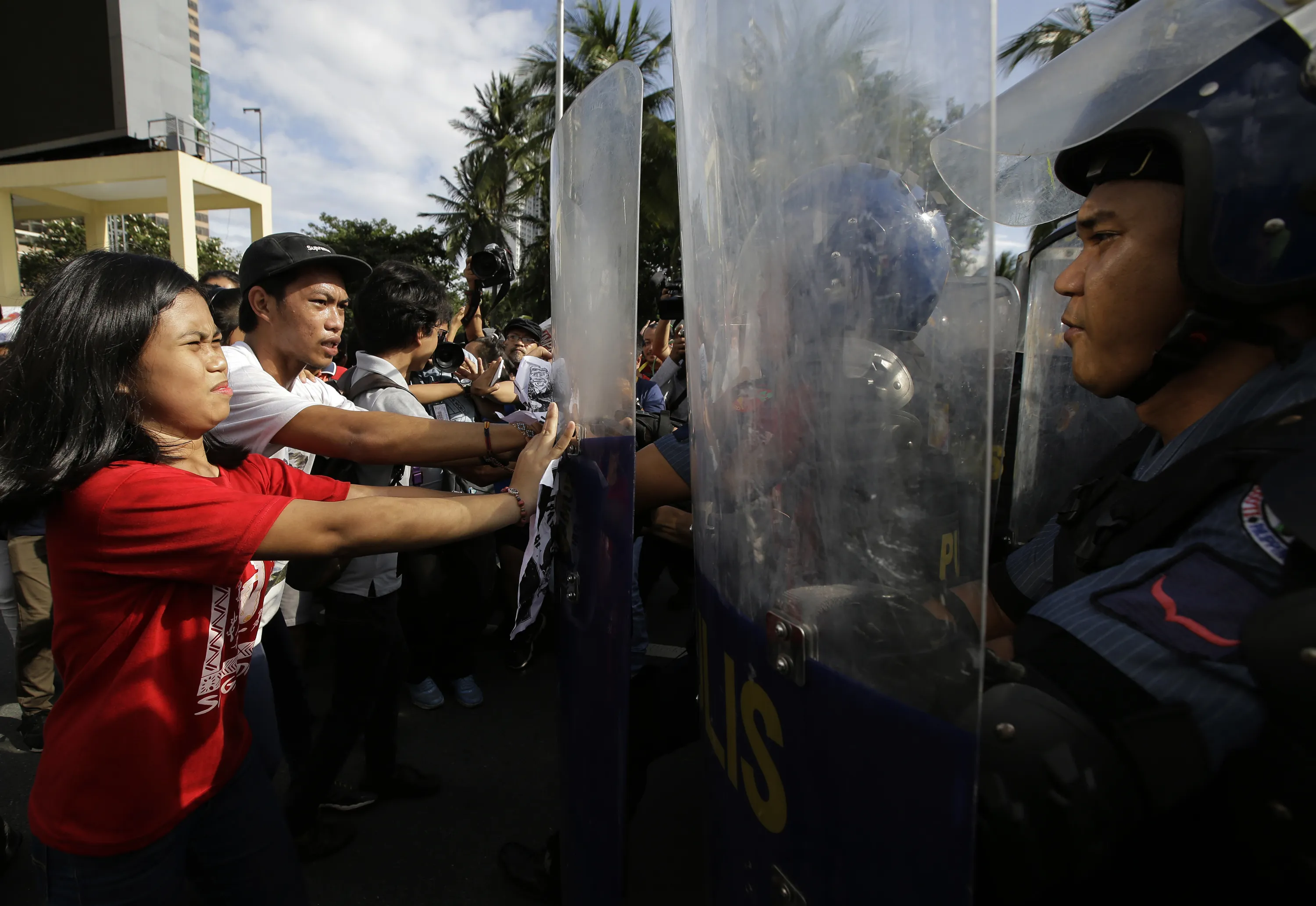 Riot police push back students protesting visiting U.S. President Donald Trump outside the ASEAN summit venue Saturday, November 11, 2017, in Manila, Philippines. Trump is currently on a visit to Asia with the Philippines as his last stop for the ASEAN leaders' summit and related summits between the regional grouping and its Dialogue Partners. (Photo by Aaron Favila/AP Photo)