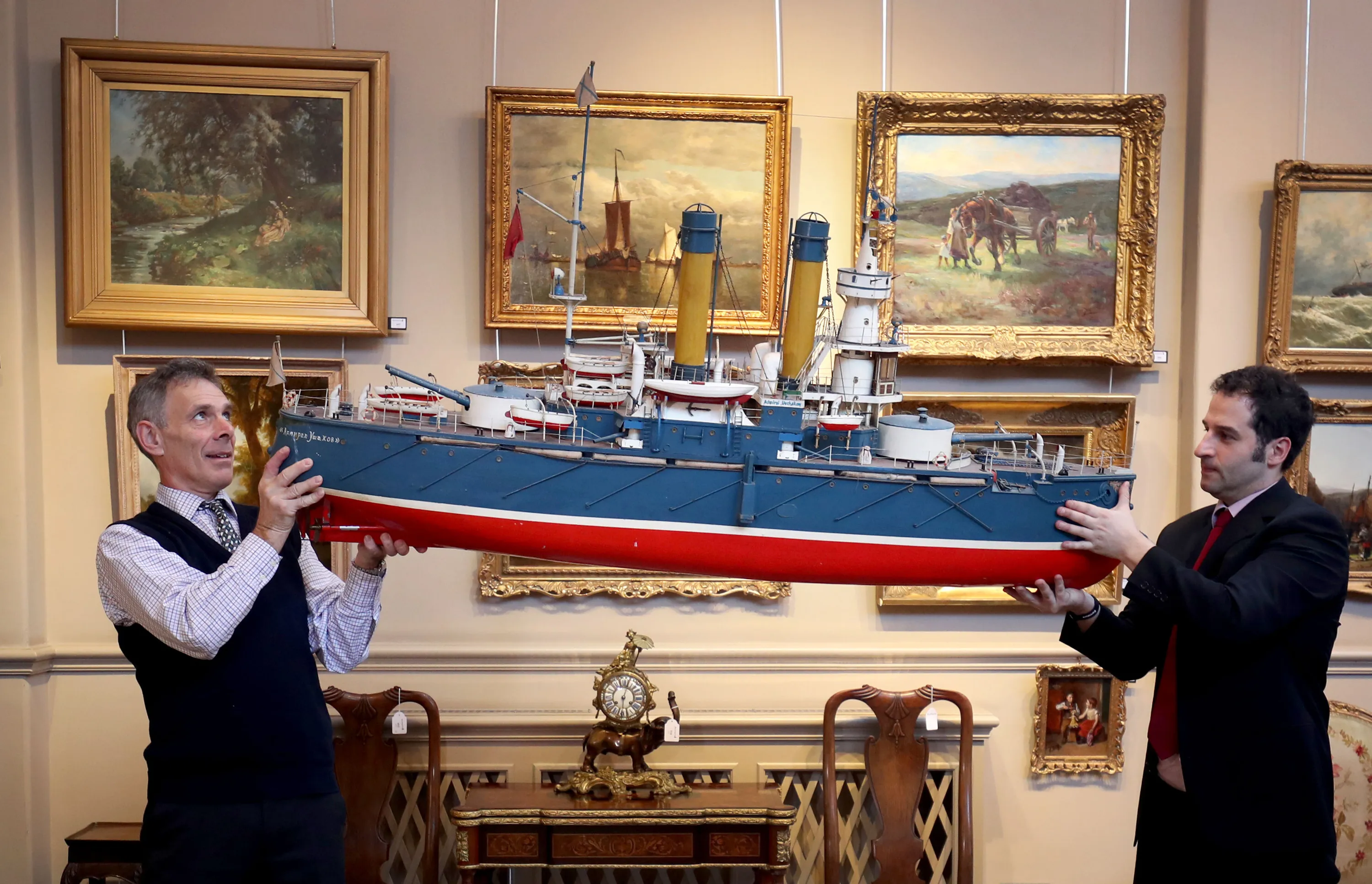 Charles Graham-Campbell (left) and Kenneth Naples, from Bonhams auction house, carry a model of the Russian ship “Admiral Oushavov” which is one of many late 19th Century and early 20th Century nautical items set to be auctioned at the Bonhams Home and Interiors sale in Edinburgh on November 10, 2017. (Photo by Jane Barlow/PA Images via Getty Images)