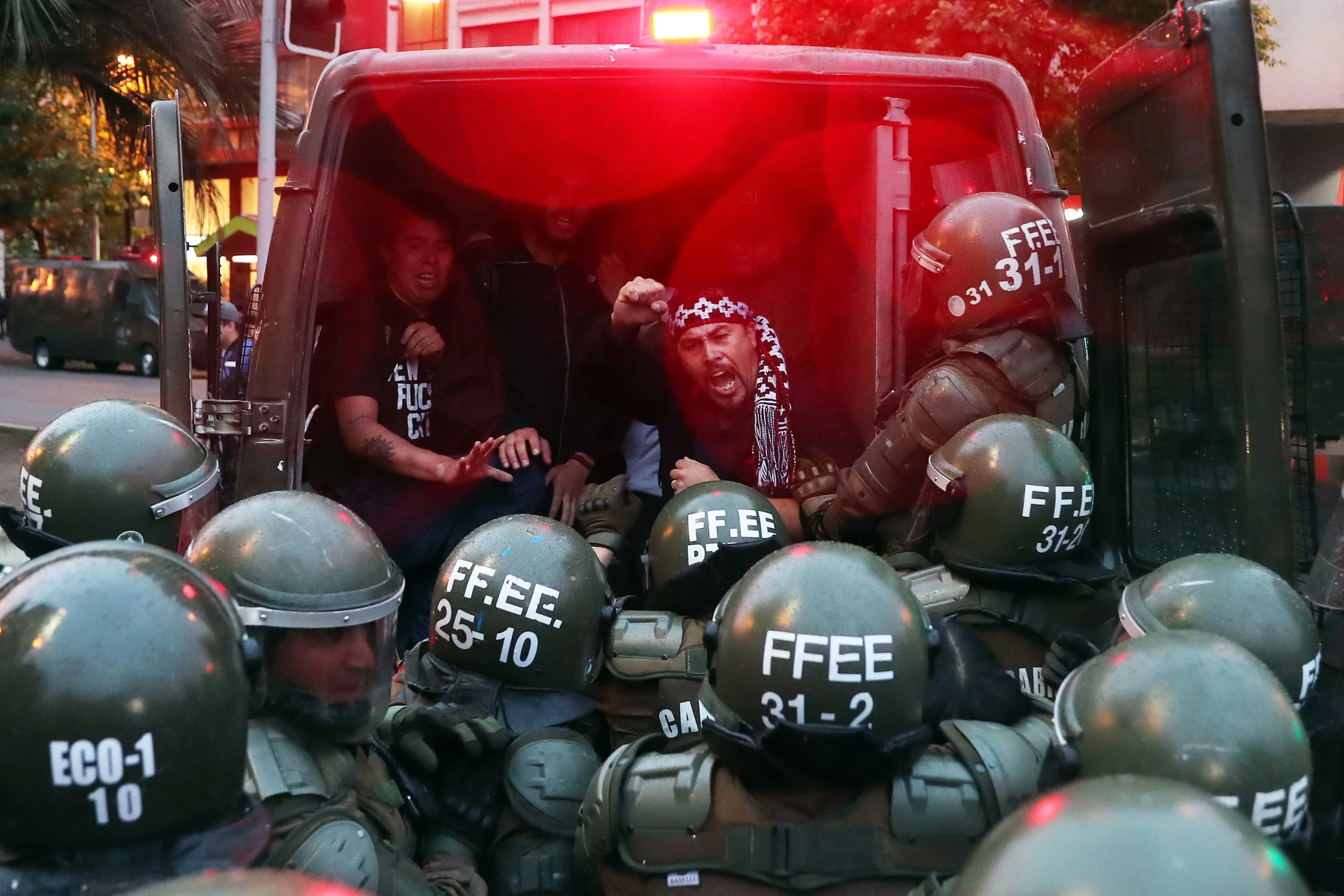 Mapuches protesters are arrested by police during a demonstration to demand justice for Brandon Hernandez Huentecol, a 17-year-old Mapuche youth whom a Carabineros national police officer allegedly shot in the back in December 2016 in southern Chile and which left him seriously injured, in Santiago, Chile, 06 November 2017. The protest, attended by about two hundred people and convened by various Mapuche organizations, sought that the alleged shooter, the second sergeant of Carabineros Cristian Rivera, answers before the court. (Photo by Mario Ruiz/EPA/EFE)
