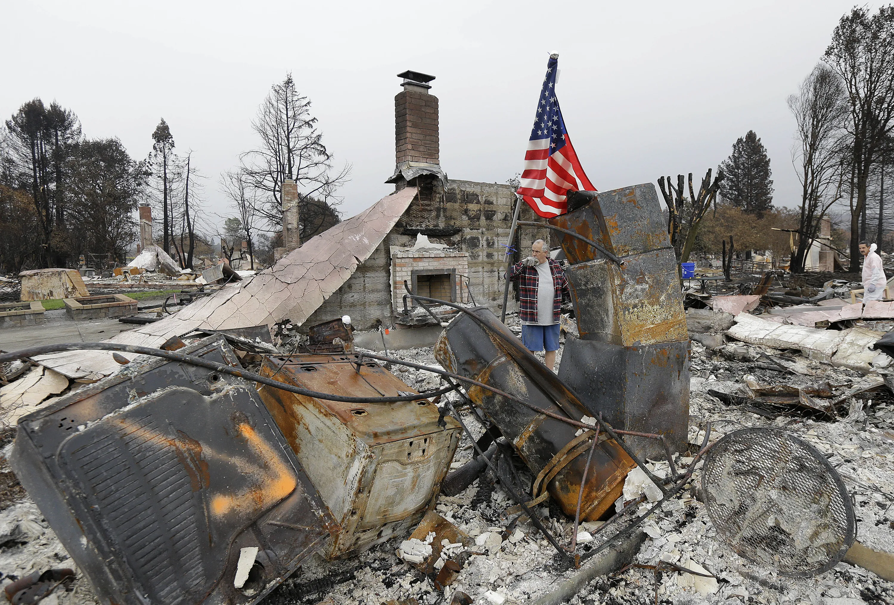 Larry Keyser looks around as he and volunteers from Samaritan's Purse disaster relief sift through remains of his family's home destroyed by fires in the Coffey Park area of Santa Rosa, Calif., Wednesday, November 8, 2017. Rumbling front loaders began scraping up the ash and rubble of nearly 9,000 destroyed homes and other structures in Northern California this week as the U.S. Army Corps of Engineers launched a new phase of the largest wildfire clean-up in the state's history. (Photo by Jeff Chiu/AP Photo)
