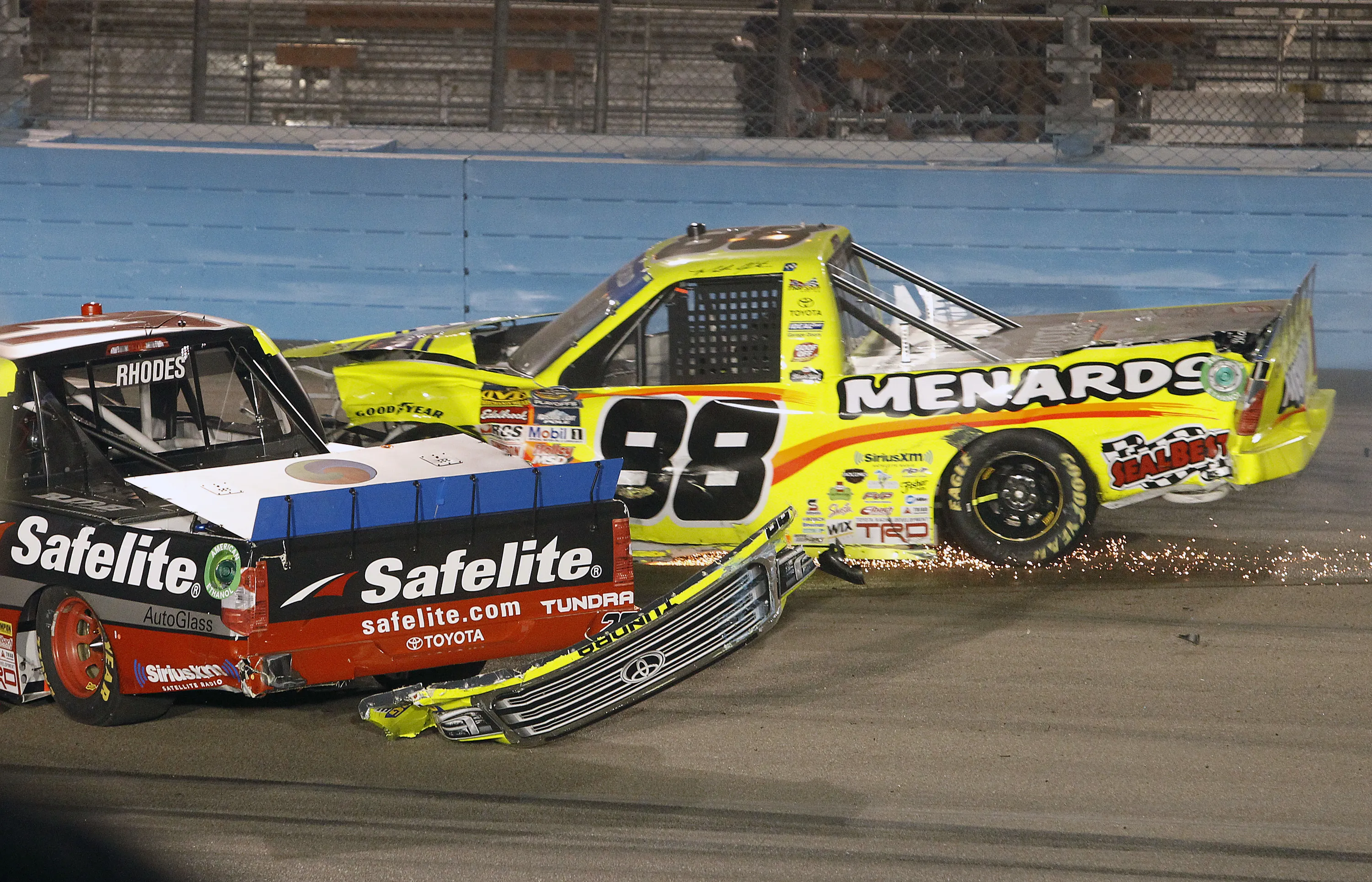 Matt Crafton (88) and Ben Rhodes crash after a restart during a NASCAR Trucks series auto race at Phoenix International Raceway, Friday, November 10, 2017, in Avondale, Ariz. (Photo by Ralph Freso/AP Photo)