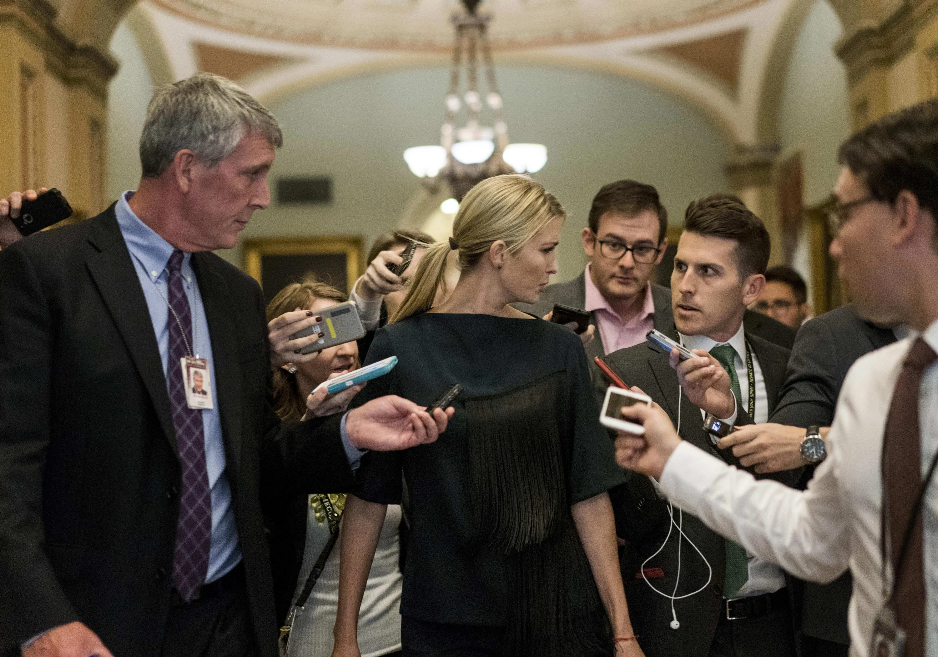 During a day of talking about the Republican tax bill, Ivanka Trump walks by a crowd of journalists at the U.S. Capitol on November 9, 2017 in Washington, DC. Ivanka Trump was seen leaving the offices of Senate Majority Whip John Cornyn. (Photo by Melina Mara/The Washington Post)
