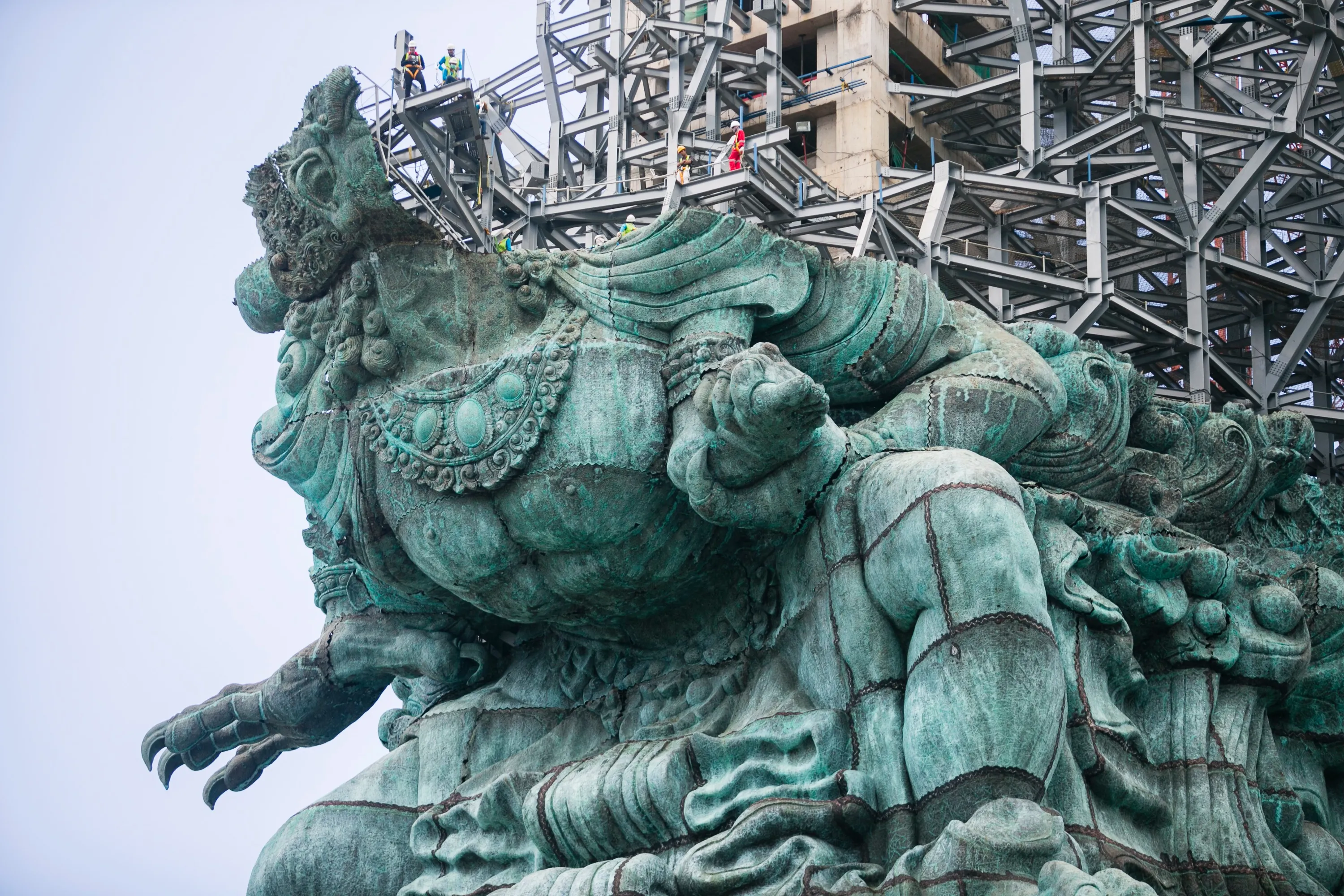 Workers are seen during the construction of Garuda Wisnu Kencana statue in Ungasan, Bali, Indonesia, 25 October 2017. The statue of the Hindu god Wisnu astride the mythical bird Garuda is to be claimed as the world's biggest statue. The statue is around 120m high and 64m wide and is targeted to be finished in September 2018. (Photo by Made Nagi/EPA/EFE)