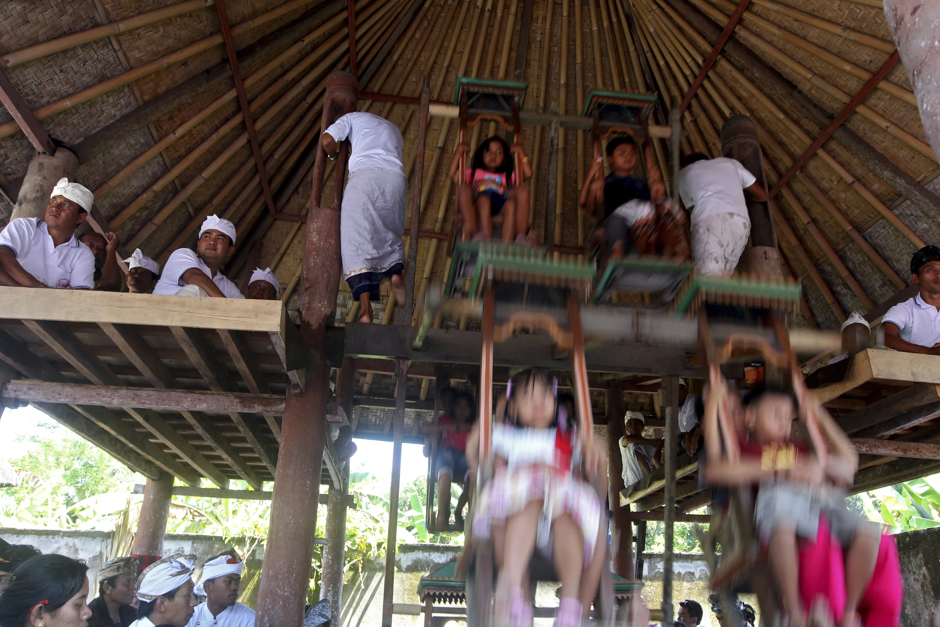 Balinese men sit as they wait for their turn to operate a traditional swing during Hindu festival of Galungan, celebrating the triumph of good over evil in Karangasem, Bali, Indonesia, Wednesday, November 1, 2017. (Photo by Firdia Lisnawati/AP Photo)