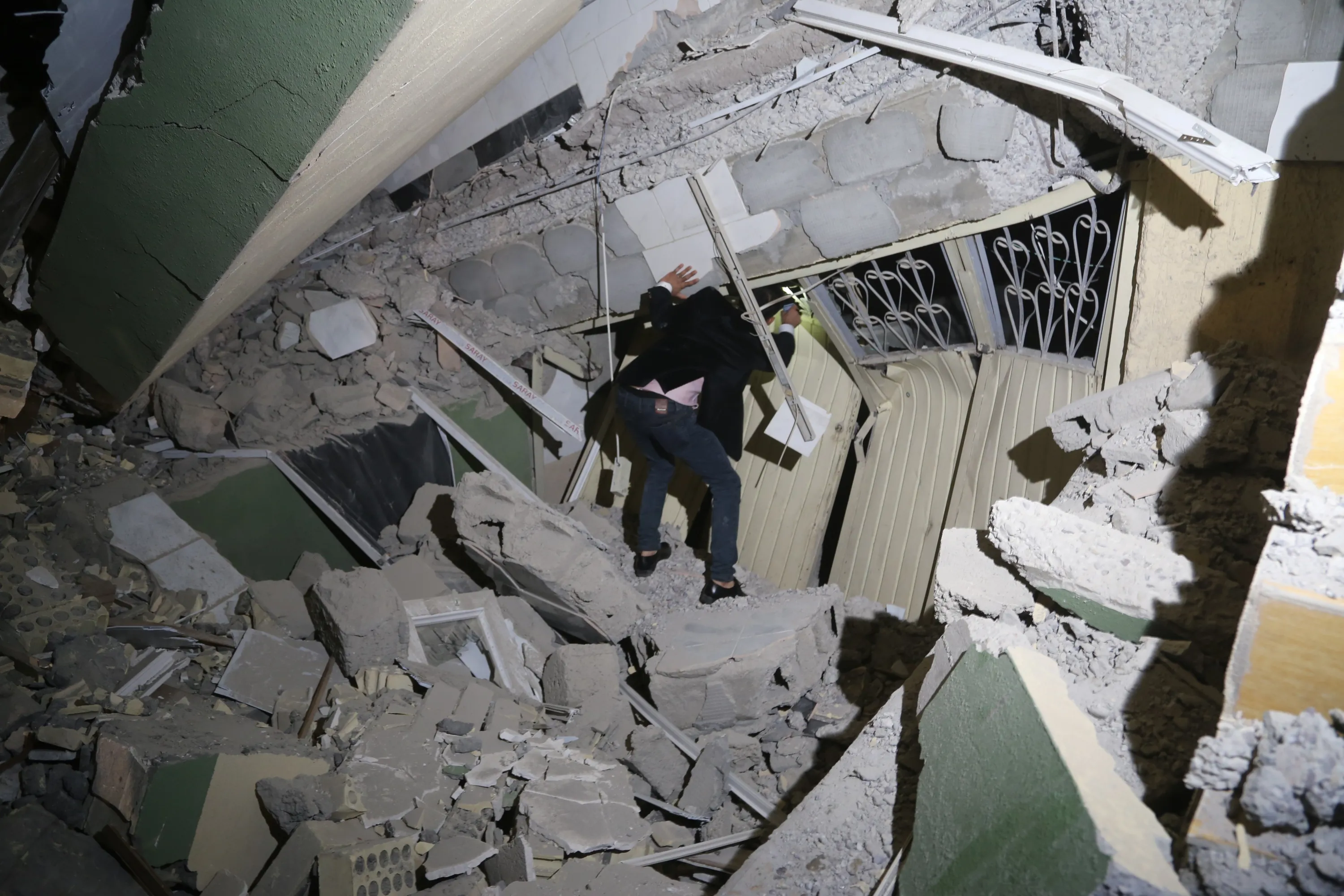 Iraqis search for the trapped citizens over the collapsed buildings after a 7.3 magnitude earthquake hit northern Iraq in Derbendihan district of Sulaymaniyah, Iraq on November 12, 2017. An earthquake measuring 7.3 on the Richter scale rocked northern Iraq and Iran, the U.S. Geological Survey said on Sunday evening. At least 61 people were killed and more than 300 others injured in Iran's border areas, according to information provided by the concerned authorities, said Iran's semi-official Fars News Agency. (Photo by Feriq Fereçc/Anadolu Agency/Getty Images)