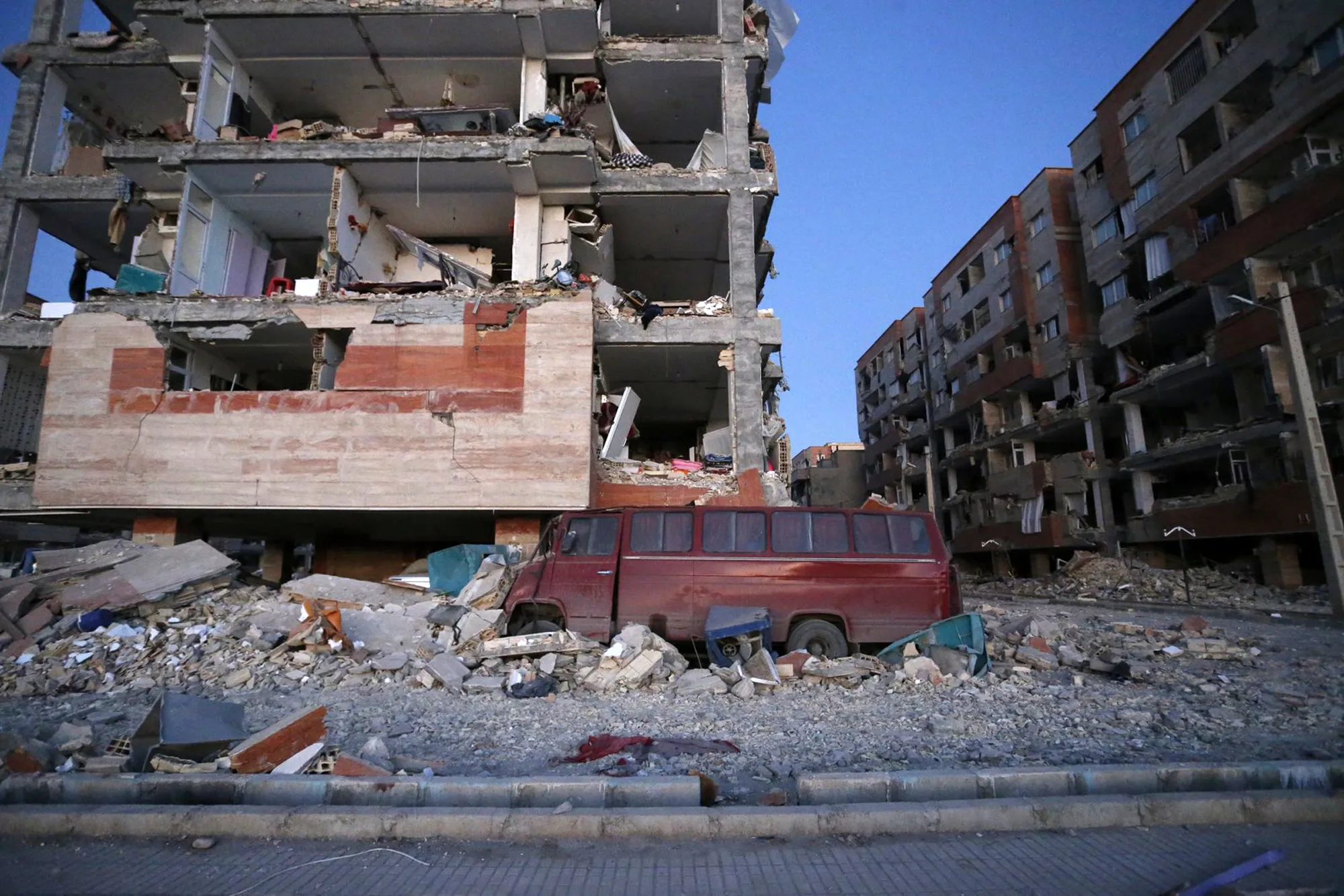 In this photo provided by the Iranian Students News Agency, ISNA, destroyed buildings and a car are seen after an earthquake at the city of Sarpol-e-Zahab in western Iran, Monday, November 13, 2017. (Photo by Pouria Pakizeh/ISNA via AP Photo)