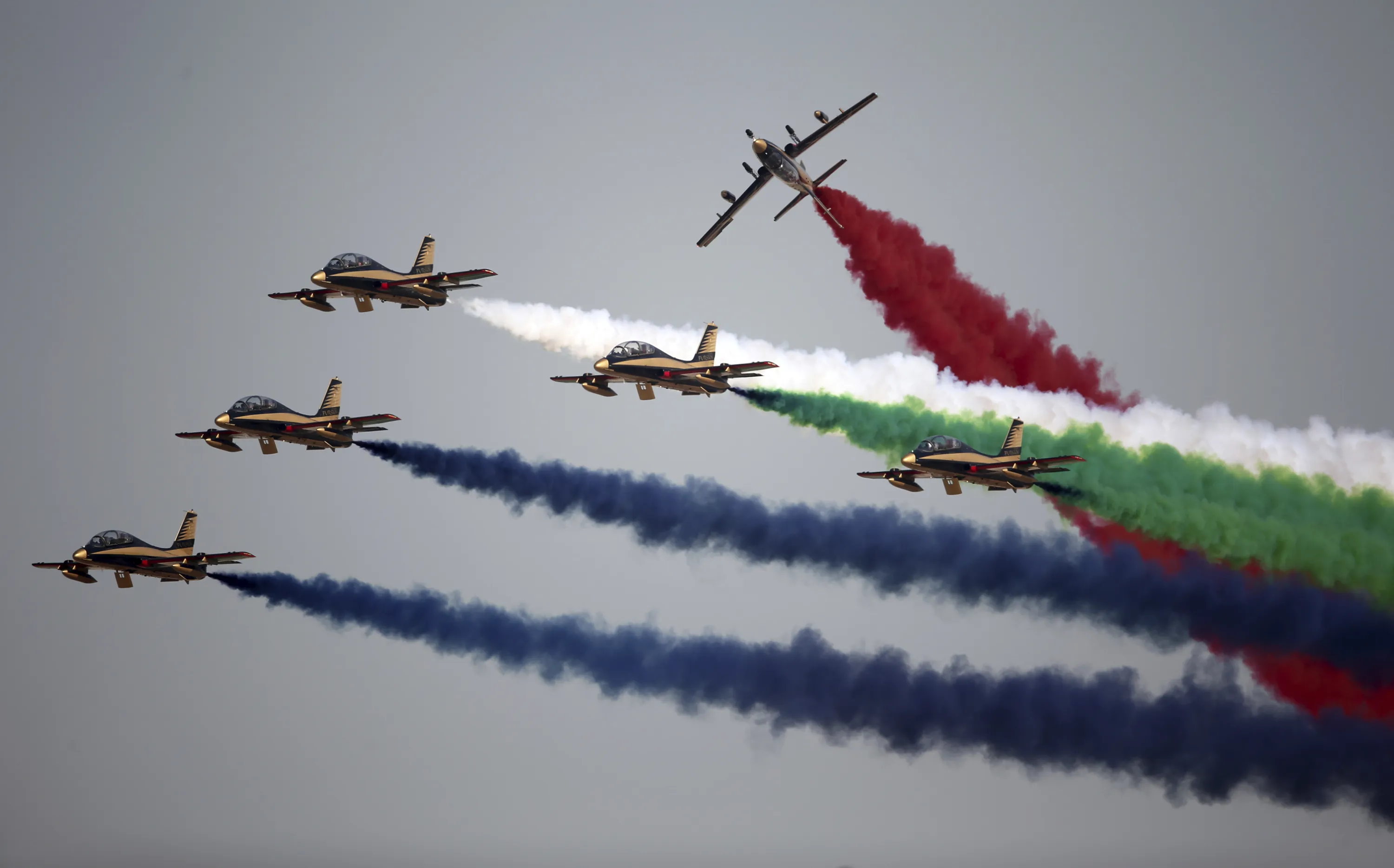 Al Fursan, or the Knights, a UAE Air Force aerobatic display team, perform on the second day of the Dubai Air Show, United Arab Emirates, Monday, November 13, 2017. (Photo by Kamran Jebreili/AP Photo)
