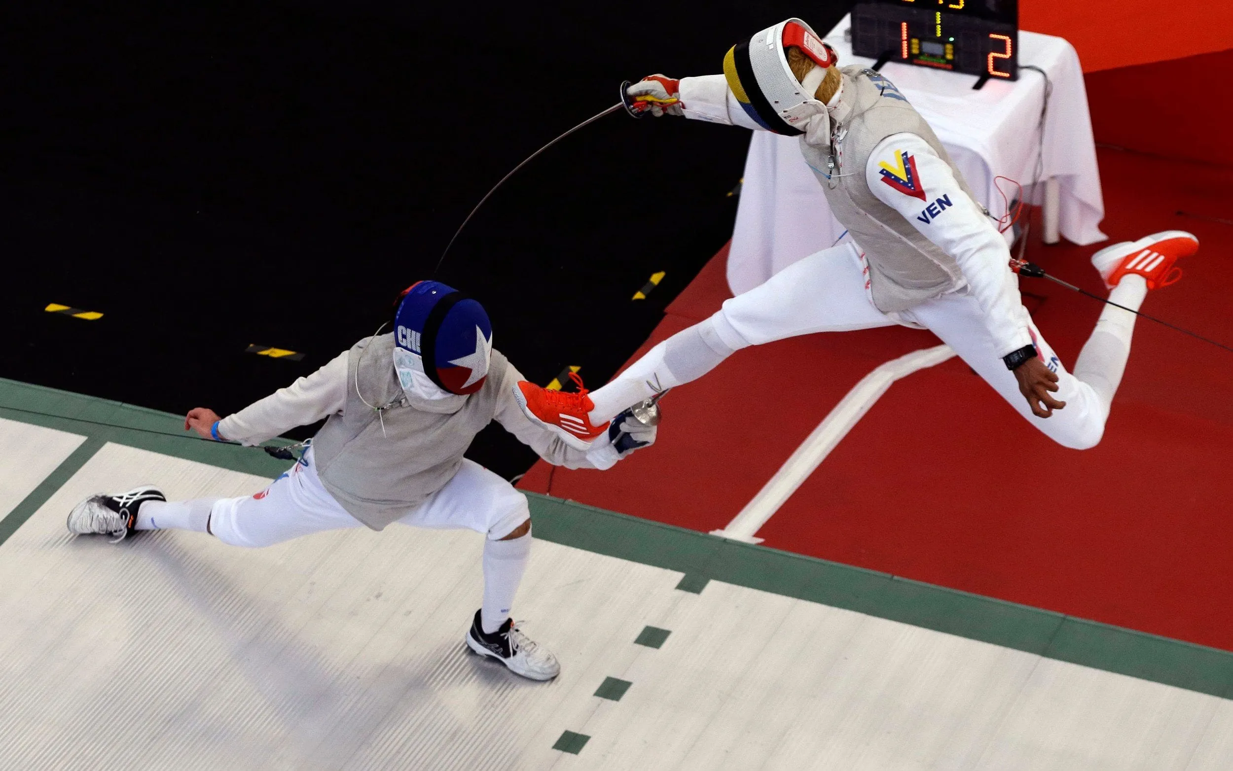 Antonio Leal of Venezuela (R) competes against Chilean Ruben Silva in their men' s individual foil round as part of the fencing event during the XVIII Bolivarian Games 2017 in Santa Marta, Colombia, on November 12, 2017. (Photo by David Sanchez/AFP Photo)