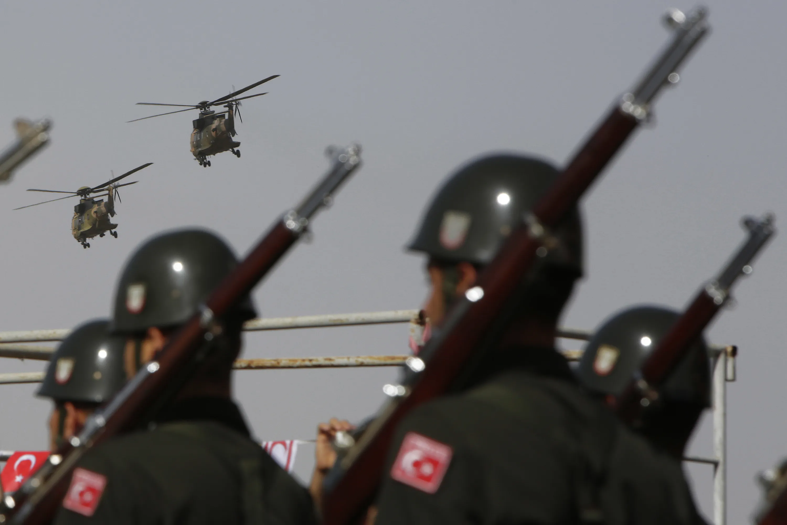Soldiers march as Turkish air force helicopters fly over a military parade in the Turkish occupied area of the divided capital Nicosia, Cyprus, Wednesday, November 15 , 2017. November 15 marks the 34rd anniversary of the unilateral declaration of independence by the occupation regime, recognized only by Turkey. (Photo by Petros Karadjias/AP Photo)