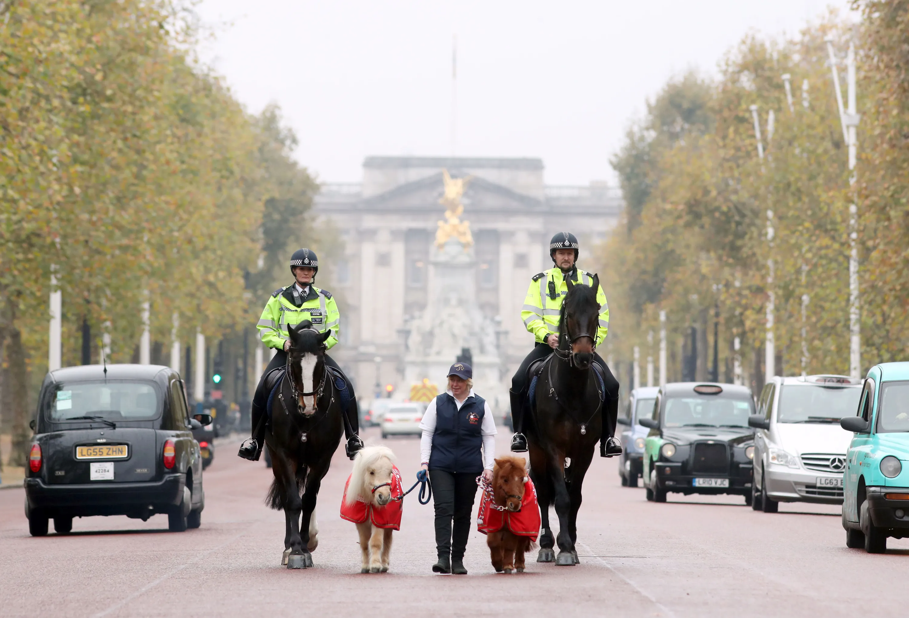 (L-R) Constable Clare Rees on Merlin, Teddy, Rachel Francis, Doris and Inspector Simon Rooke on Quixote. Metropolitan Police (MPS) Horses, Merlin and Quixote, are joined on patrol in central London by some special helpers, miniature Shetland ponies Teddy and Doris, ahead of their appearances at Olympia's London International Horse Show at The Mall on November 15, 2017 in London, England. (Photo by Steve Parsons/PA Wire)