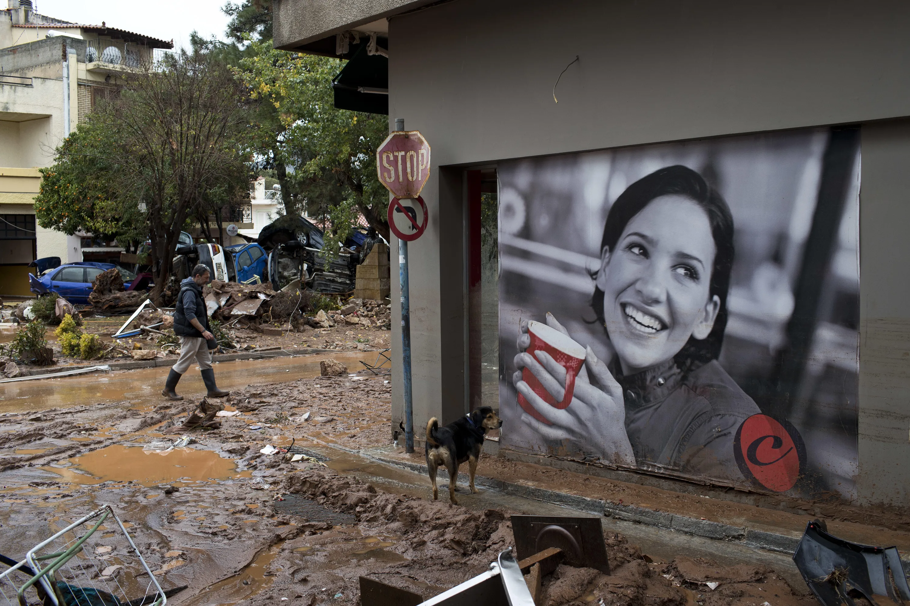 A dog stands as a man walks in front of washed up cars in the town of Mandra western Athens, on Thursday, November 16, 2017. (Photo by Petros Giannakouris/AP Photo)