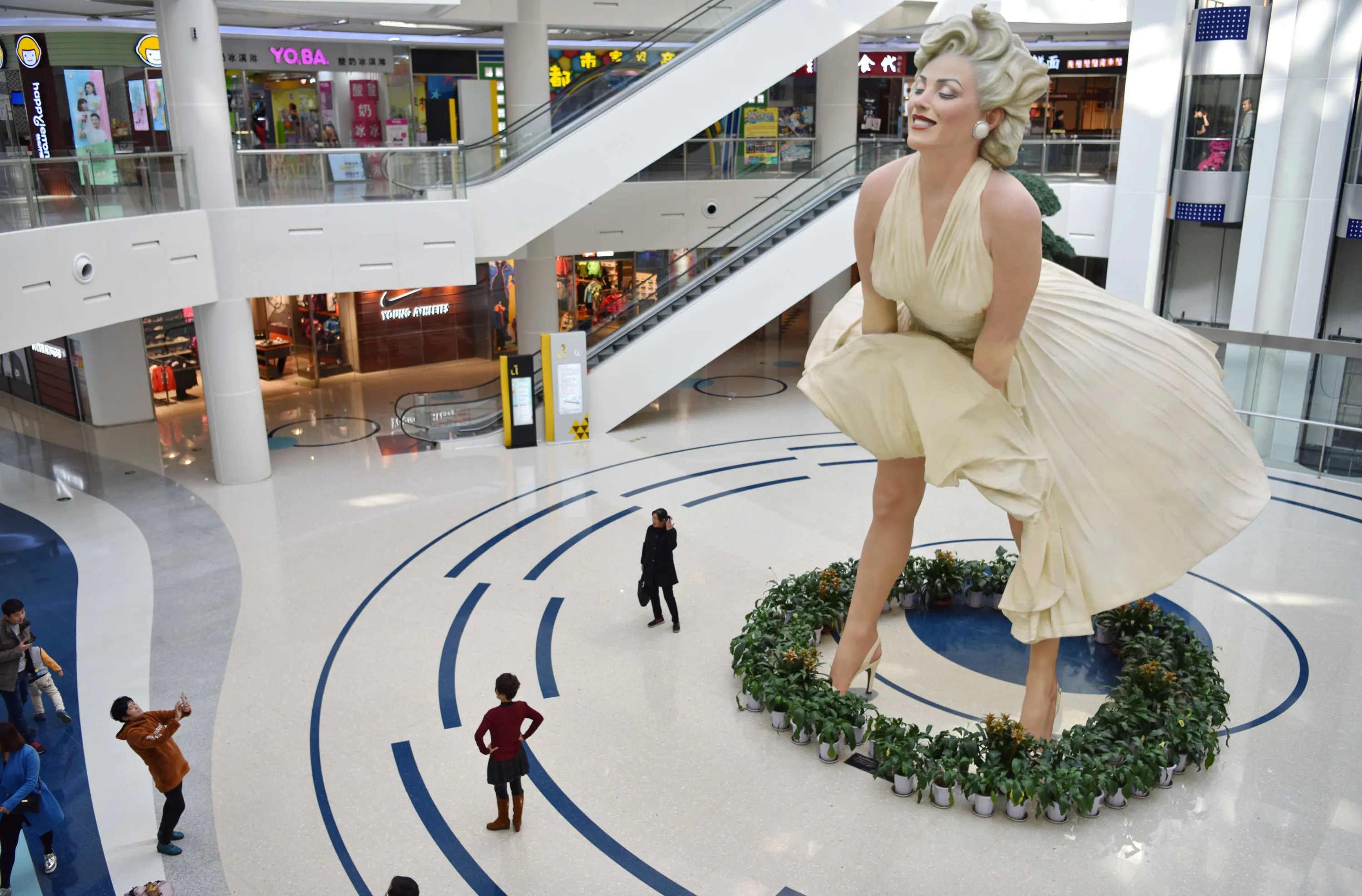A massive, 8 metre tall sculpture of Marilyn Monroe, frozen with her dress blowing up, was on display at a shopping mall in downtown Dalian city, northeast China's Liaoning province, on Tuesday, November 14, 2017. The sculpture is a replica of Seward Johnson's Forever Marilyn in Chicago. (Photo by Imagine China/Rex Features/Shutterstock)