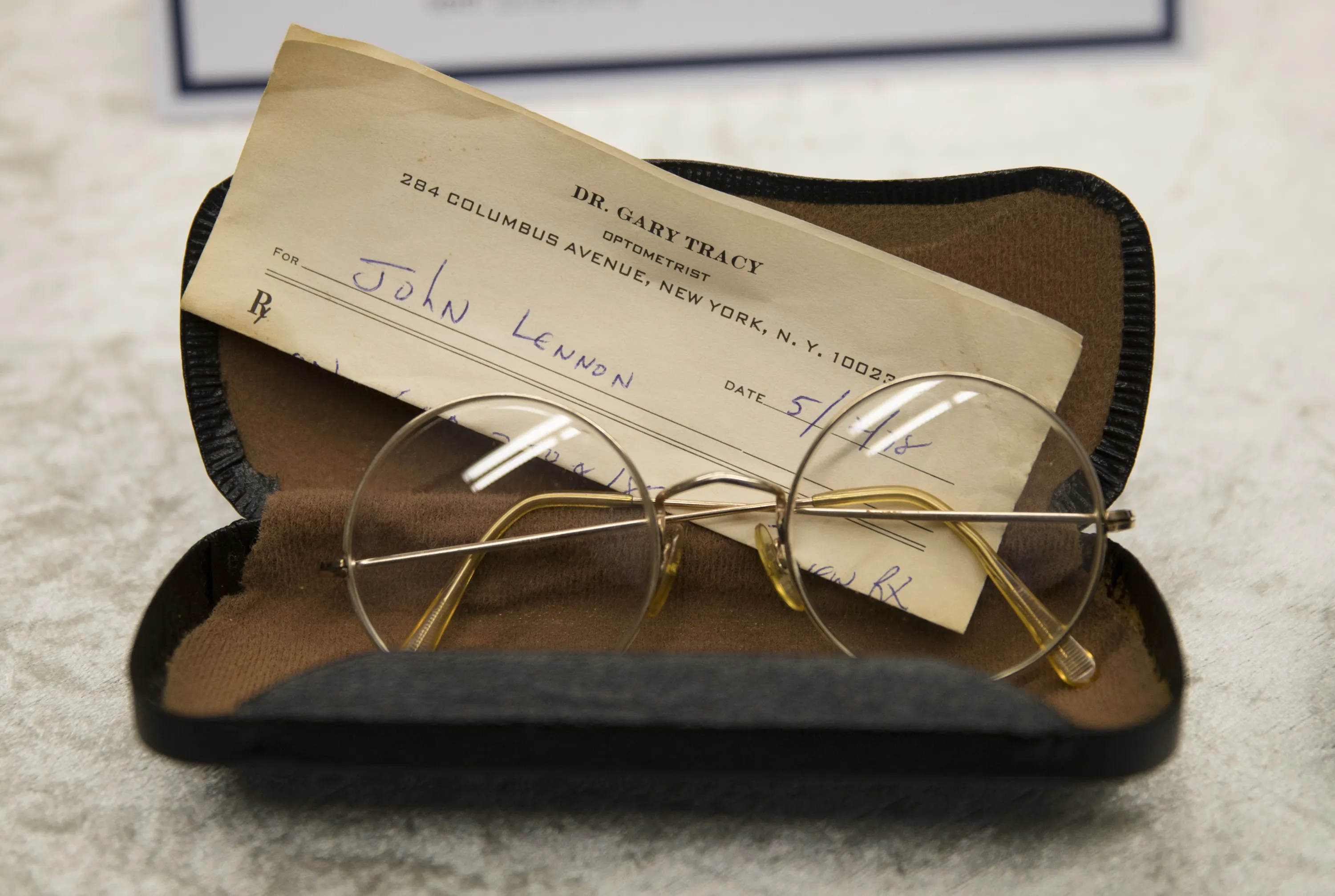 A pair of John Lennon's glasses with a prescription by optometrist Gary Tracy are displayed at the police headquarters in Berlin, Tuesday, November 21, 2017, after German police arrested a man suspected of handling stolen objects from Lennon's estate, including diaries which were stolen from Lennon's widow, Yoko Ono, in New York in 2006. (Photo by Markus Schreiber/AP Photo)
