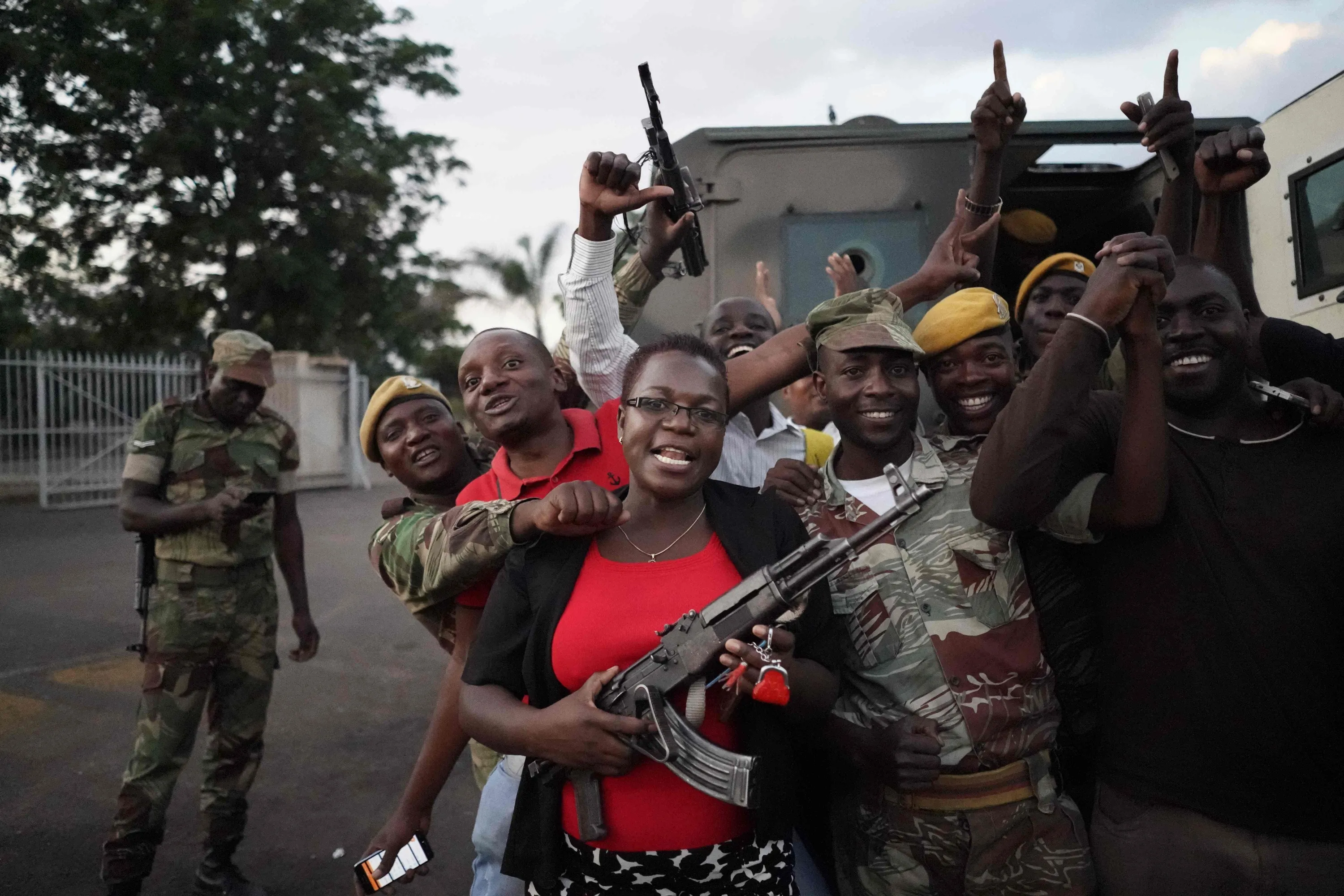 People and soldiers celebrate after the resignation of Zimbabwe' s president on November 21, 2017 in Harare. Car horns blared and cheering crowds raced through the streets of the Zimbabwean capital Harare as news spread that President Robert Mugabe, 93, had resigned after 37 years in power. (Photo by Marco Longari/AFP Photo)